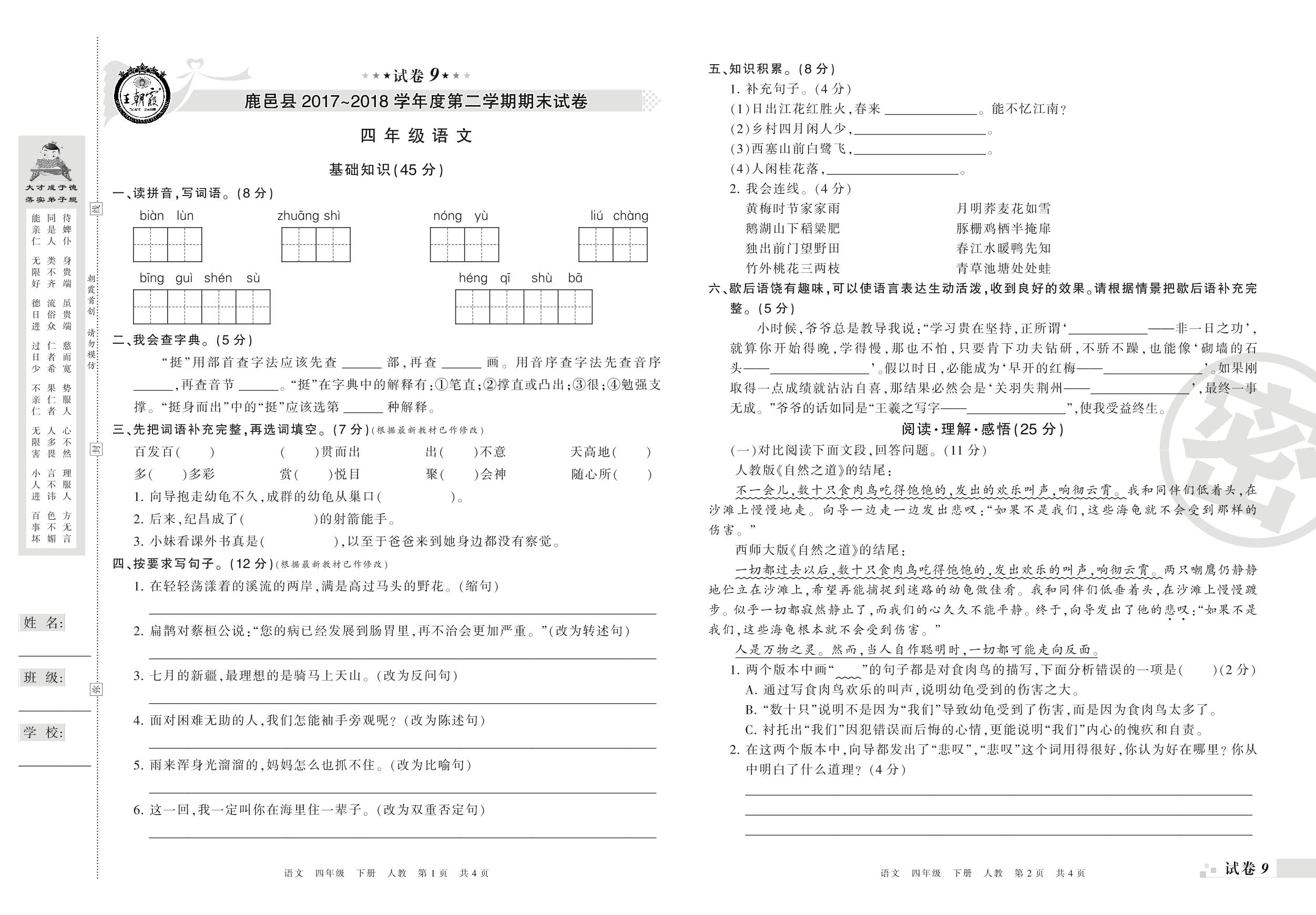 2017-2018学年第二学期周口市鹿邑县四年级语文试卷(人教版)【9】