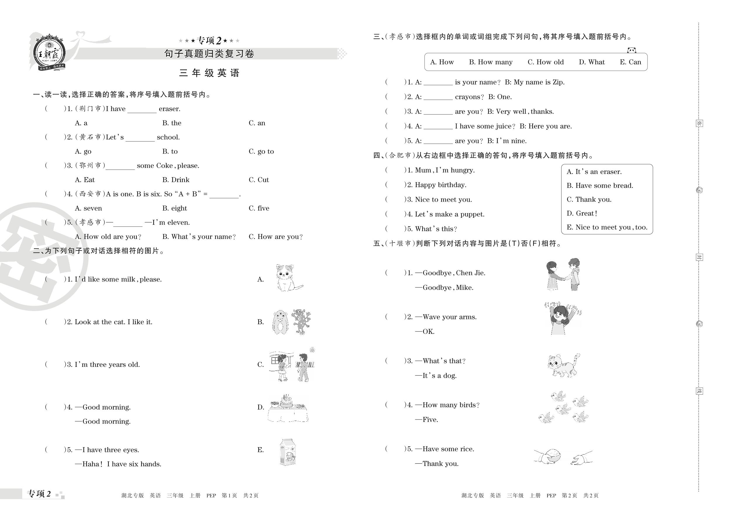 王朝霞期末专项卷——句子真题归类复习卷三年级上册英语(人教PEP版)【2】