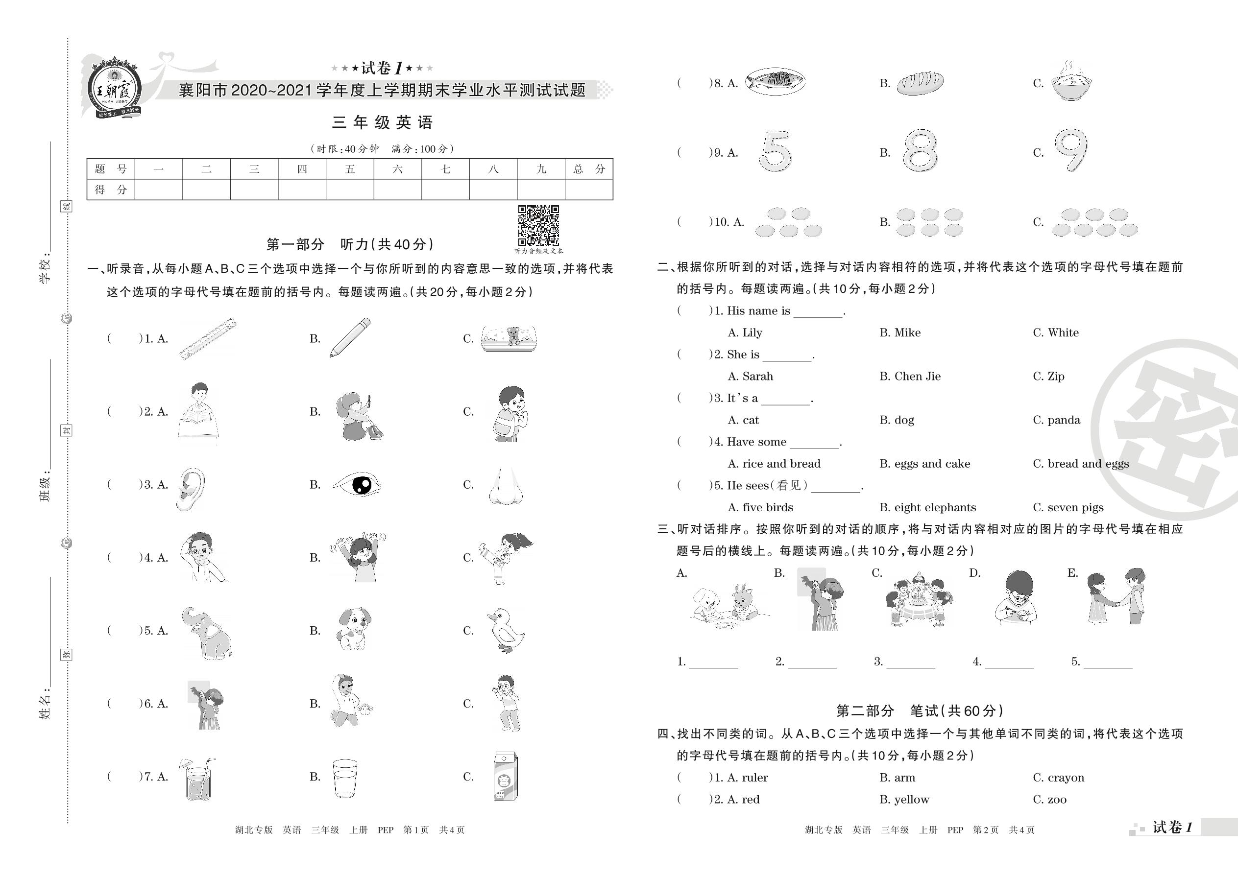 襄阳市2020~2021学年度上学期期末学业水平测试试题三年级英语(人教PEP版)【1】