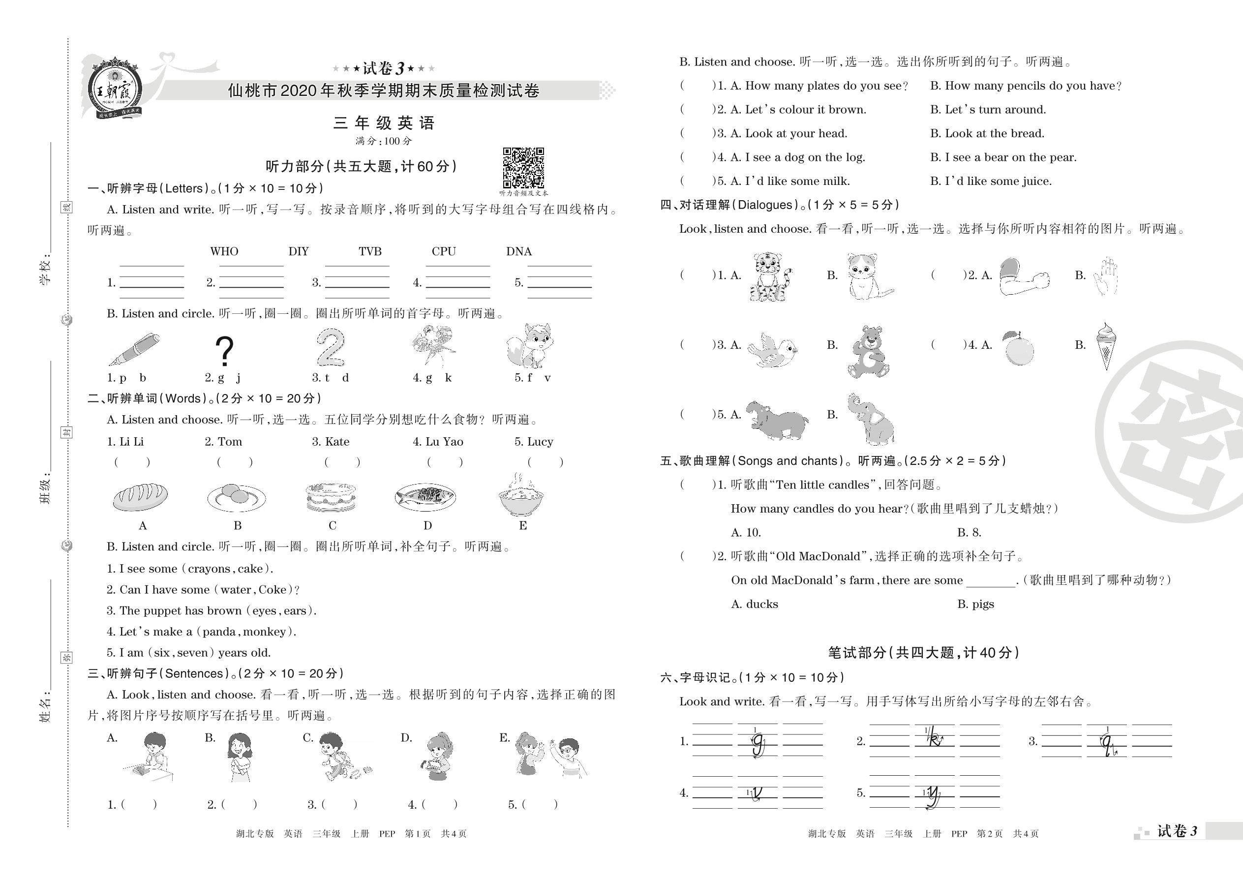 仙桃市2020年秋季学期期末质量检测试卷三年级英语(人教PEP版)【3】