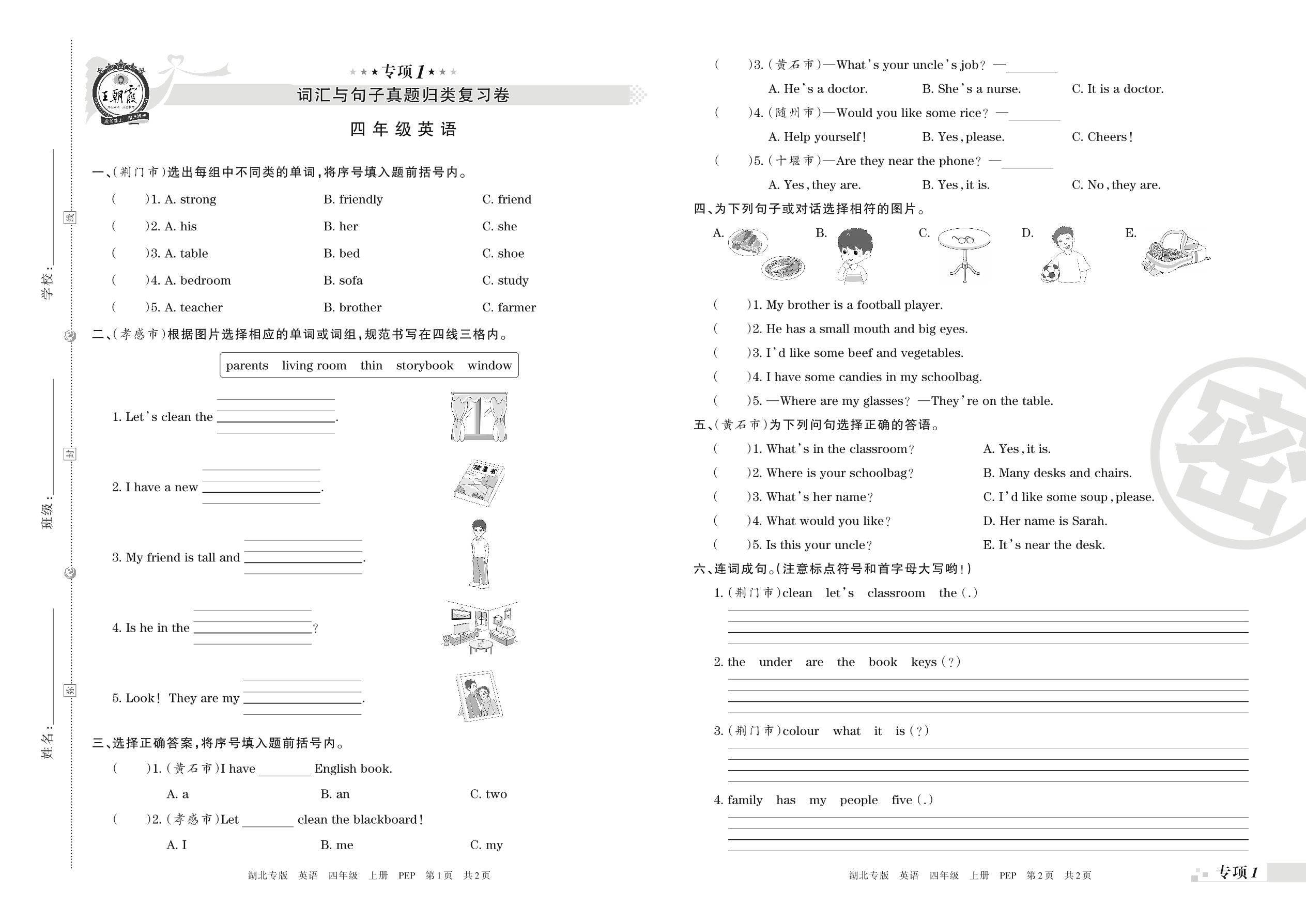 王朝霞期末专项卷——词汇与句子真题归类复习卷四年级上册英语(人教PEP版)【1】