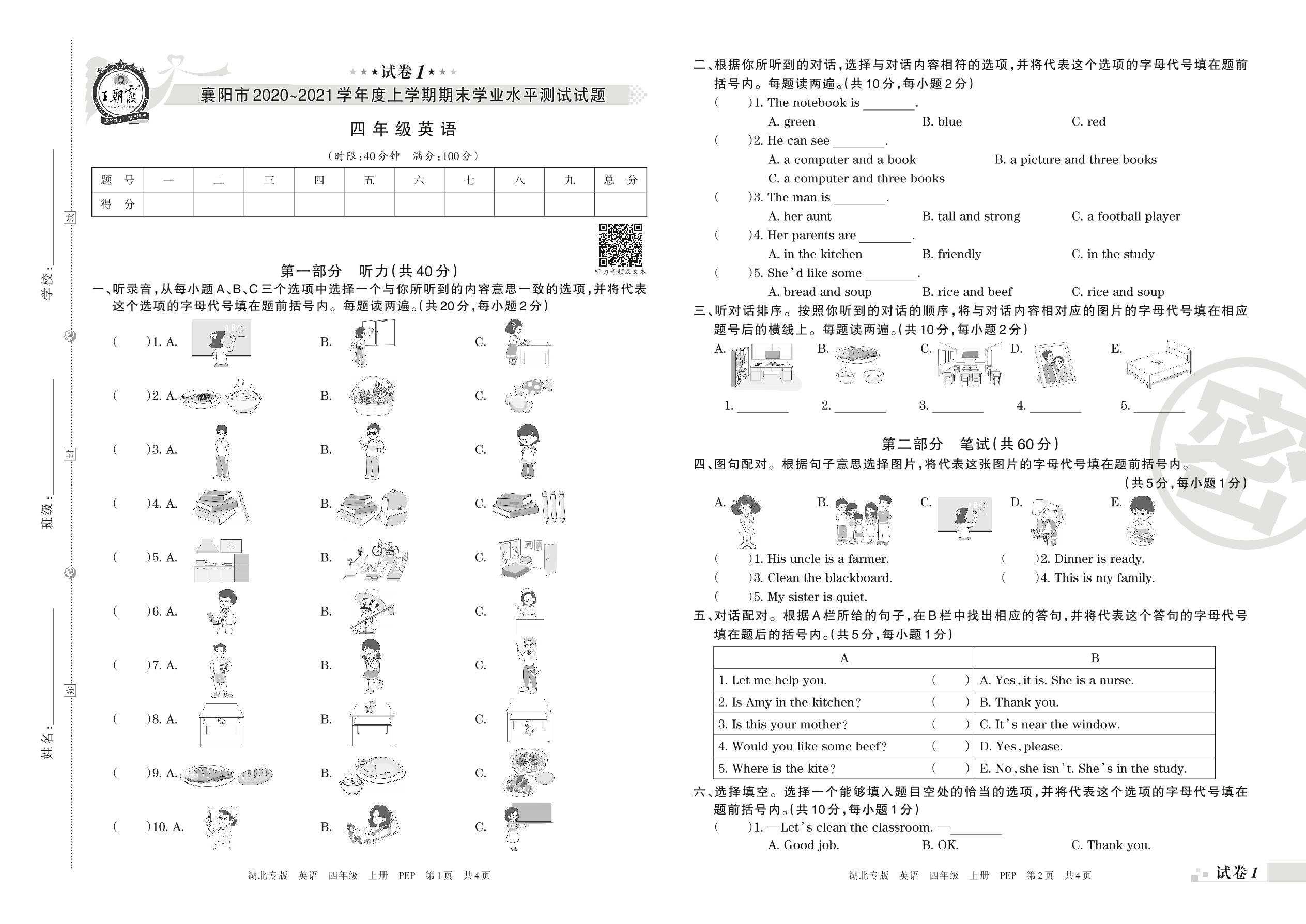 襄阳市2020~2021学年度上学期期末学业水平测试试题四年级英语(人教PEP版)【1】