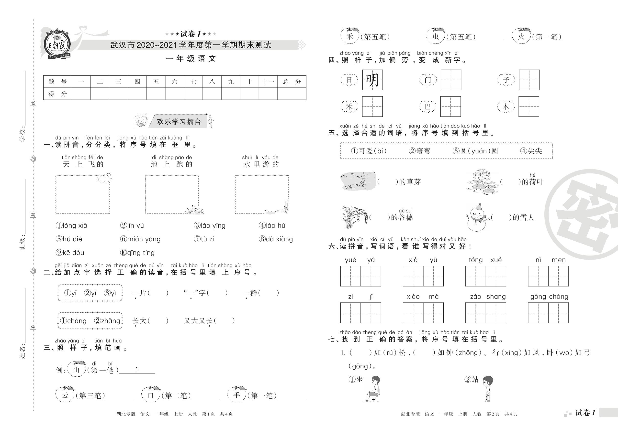 武汉市2020~2021学年度第一学期期末测试一年级语文(人教版)【1】