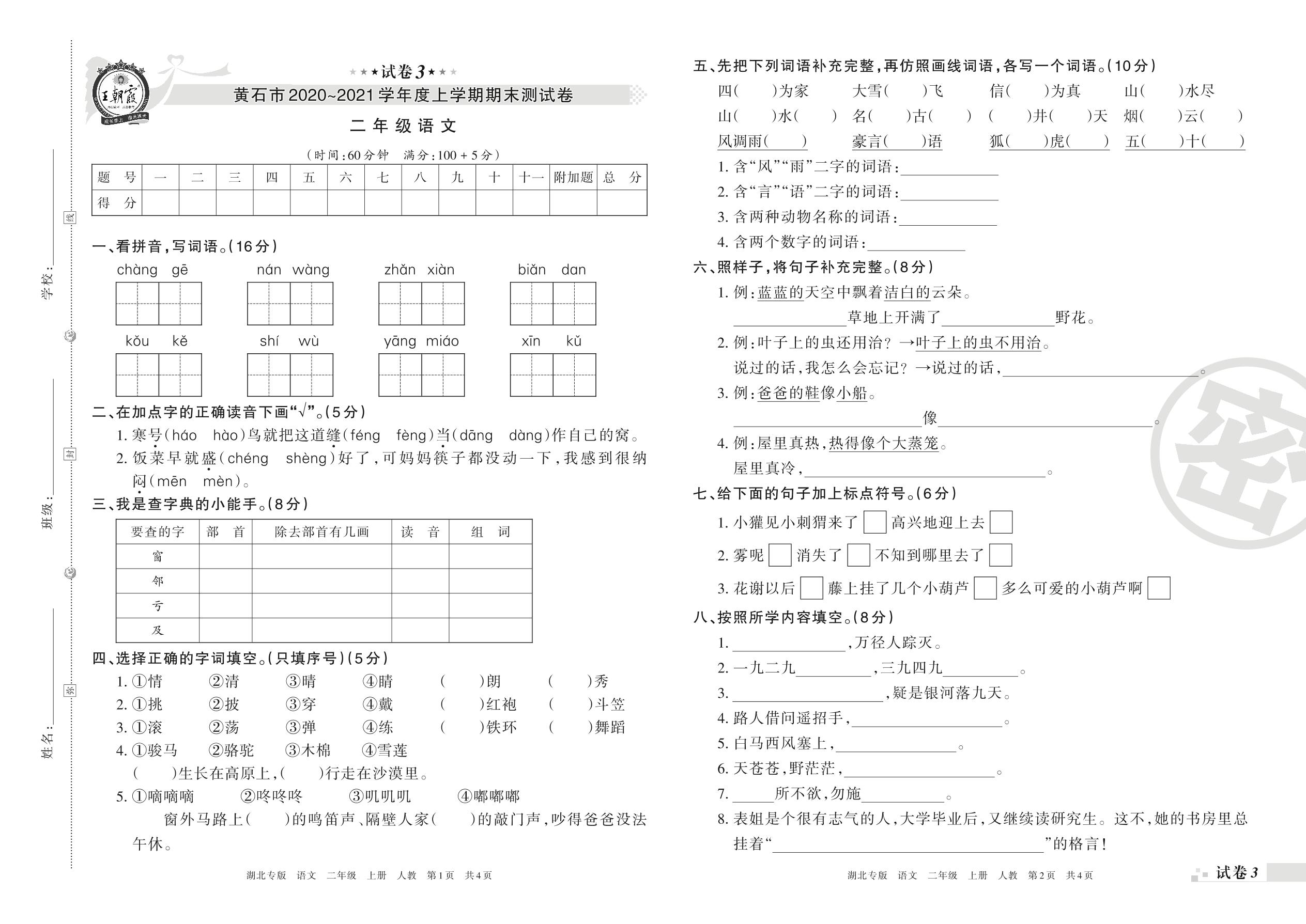 黄石市2020~2021学年度上学期期末测试卷二年级语文(人教版)【3】