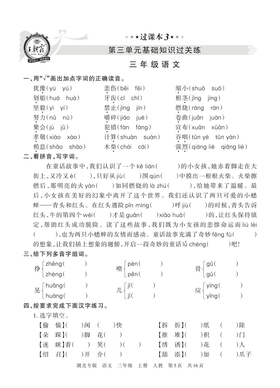 王朝霞期末过课本——第三单元基础知识过关练三年级上册语文(人教版)【3】