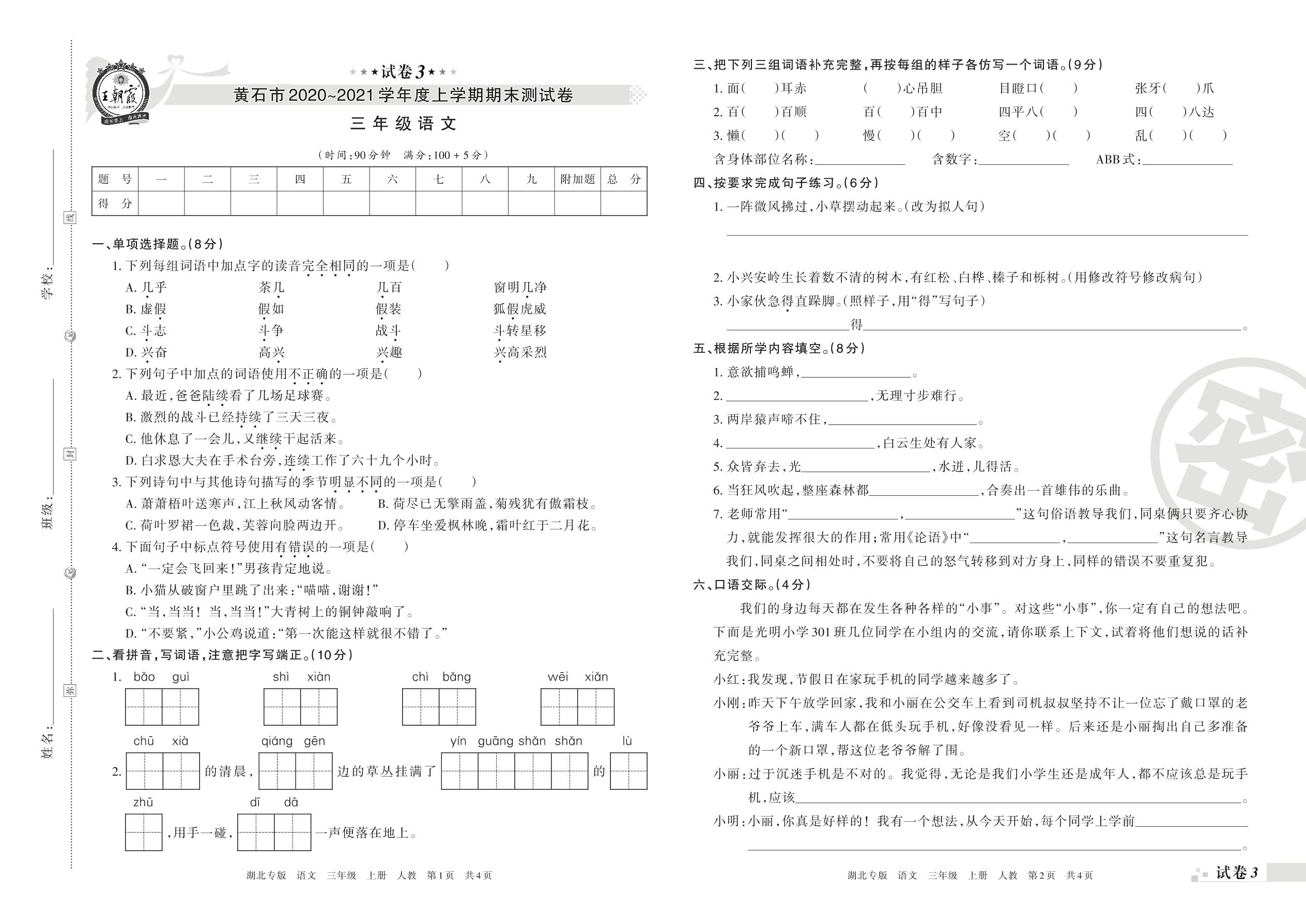黄石市2020~2021学年度上学期期末测试卷三年级语文(人教版)【3】