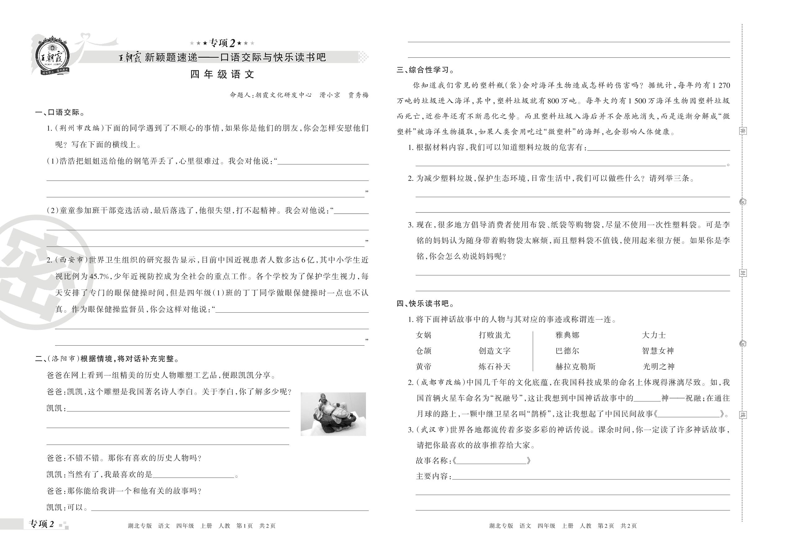 王朝霞期末专项卷——新颖题速递:口语交际与快乐读书吧四年级上册语文(人教版)【2】