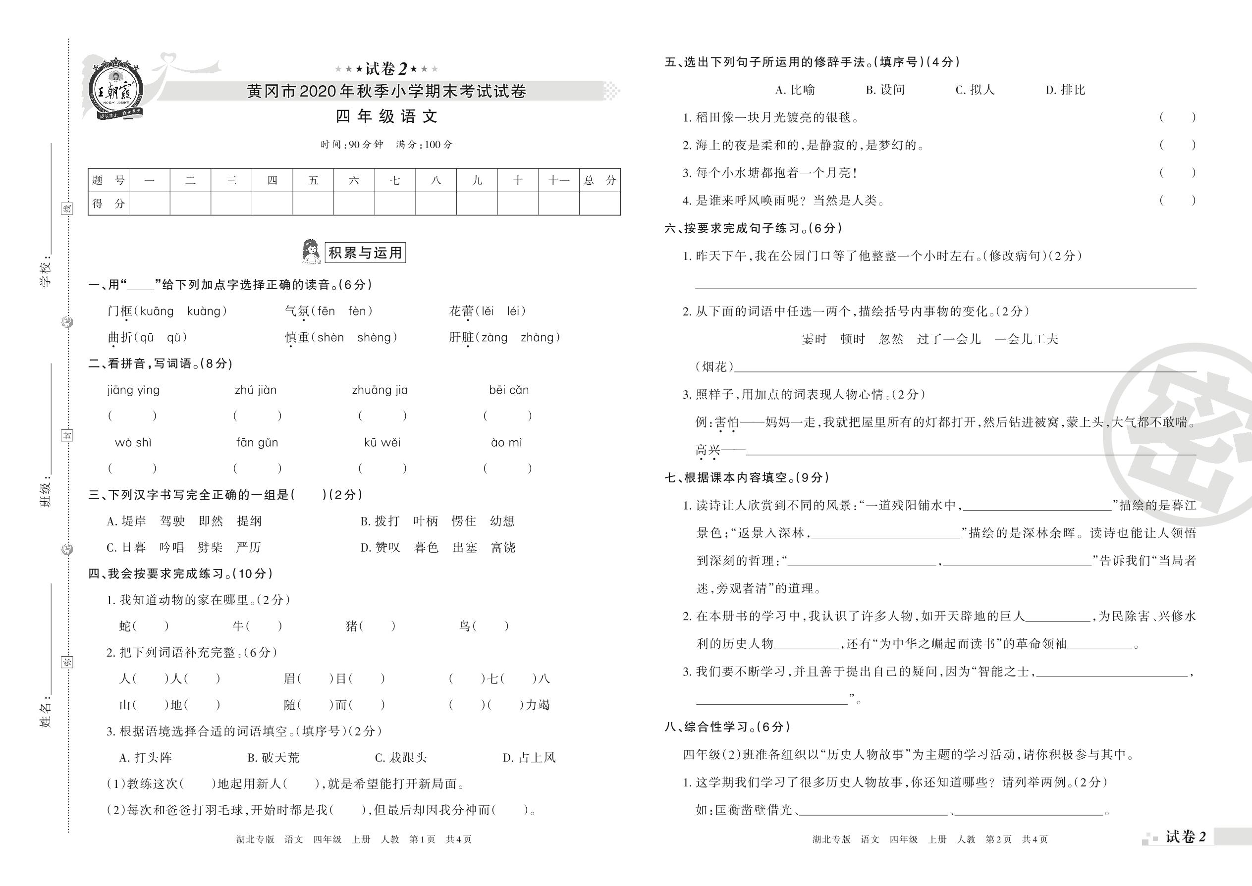 黄冈市2020年秋季小学期末考试试卷四年级语文(人教版)【2】