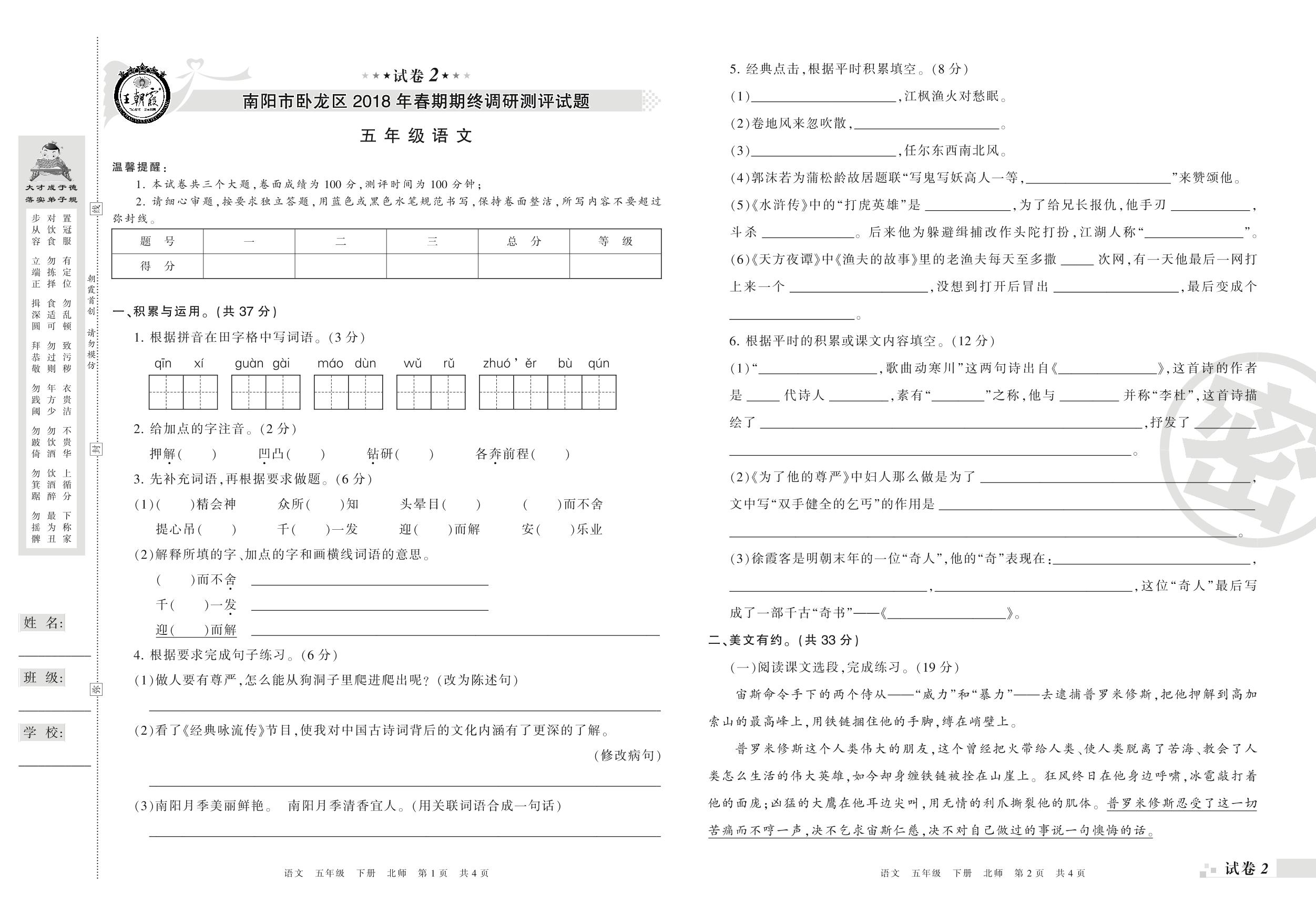 2017-2018学年第二学期南阳市卧龙区五年级语文试卷(北师版)【2】