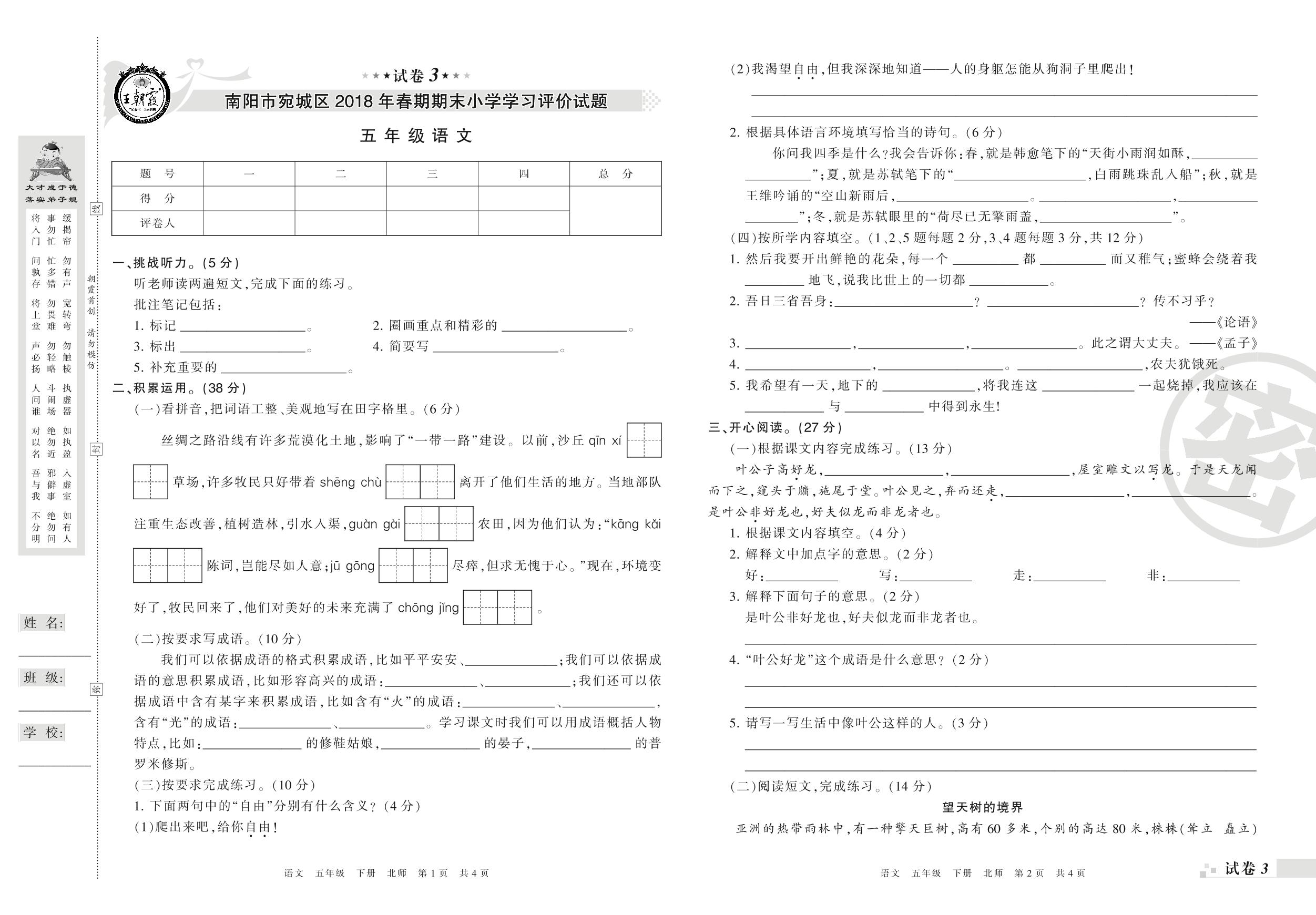 2017-2018学年第二学期南阳市宛城区五年级语文试卷(北师版)【3】
