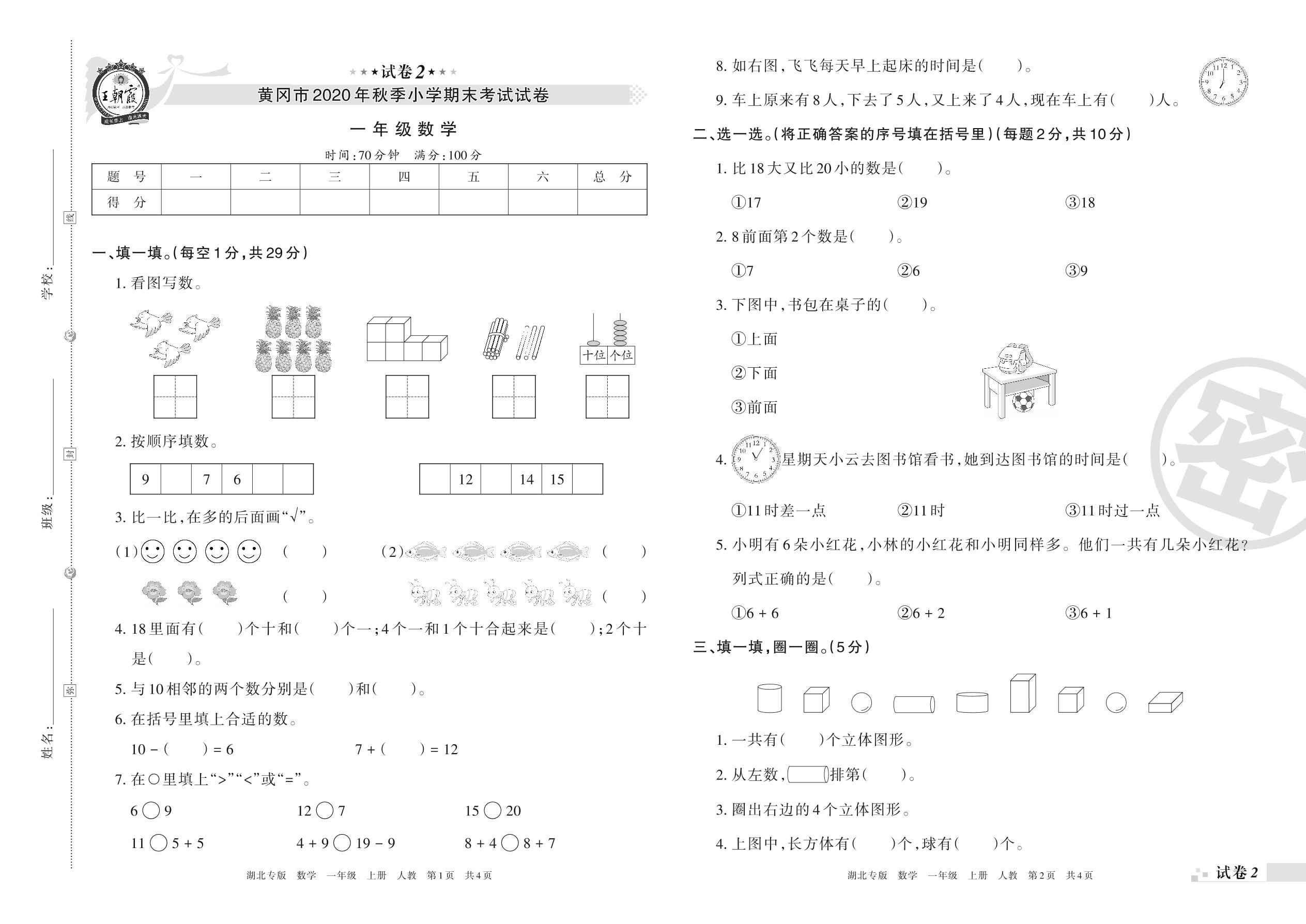 黄冈市2020年秋季小学期末考试试卷一年级数学(人教版)【2】