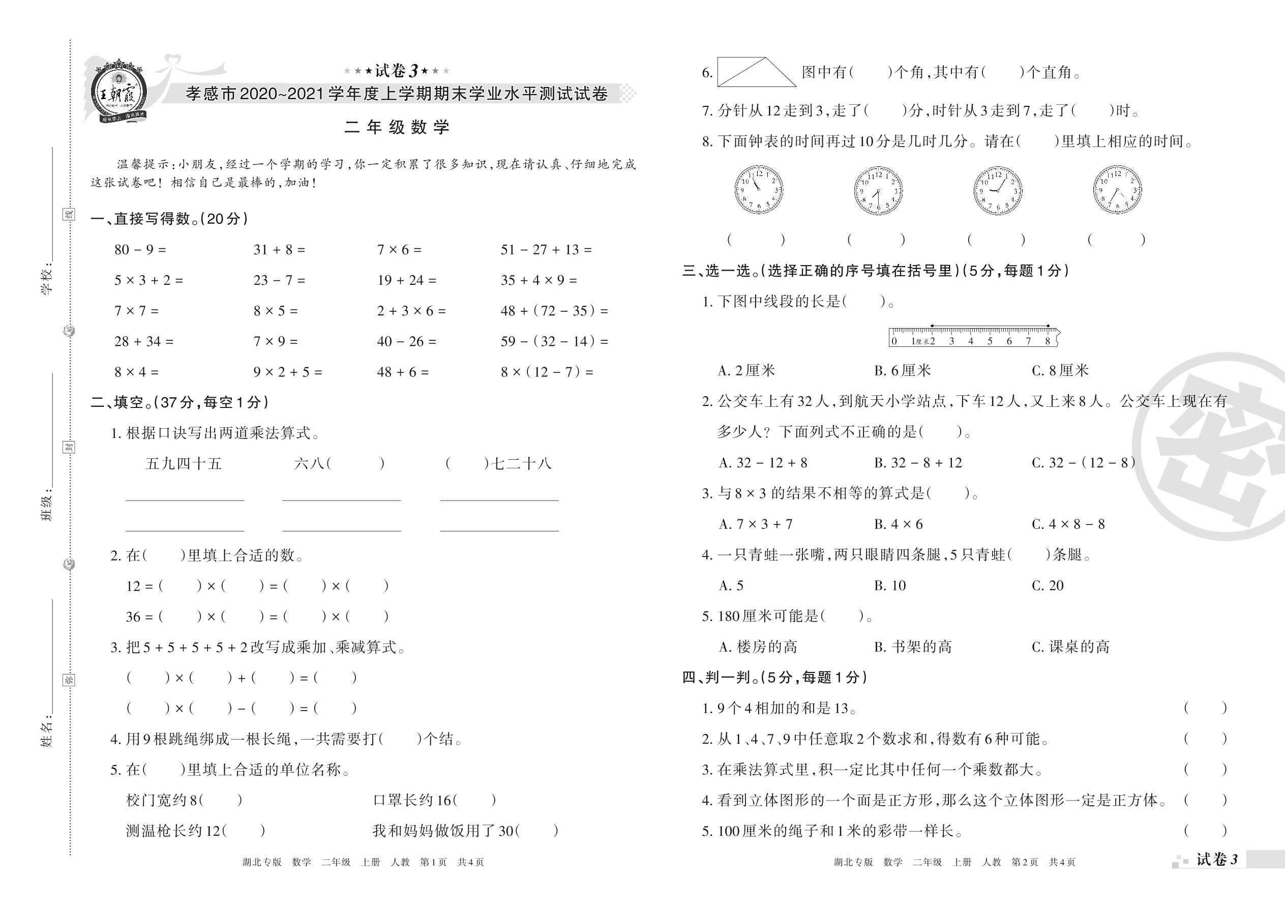 孝感市2020~2021学年度上学期期末学业水平测试试卷二年级数学人教版【3】