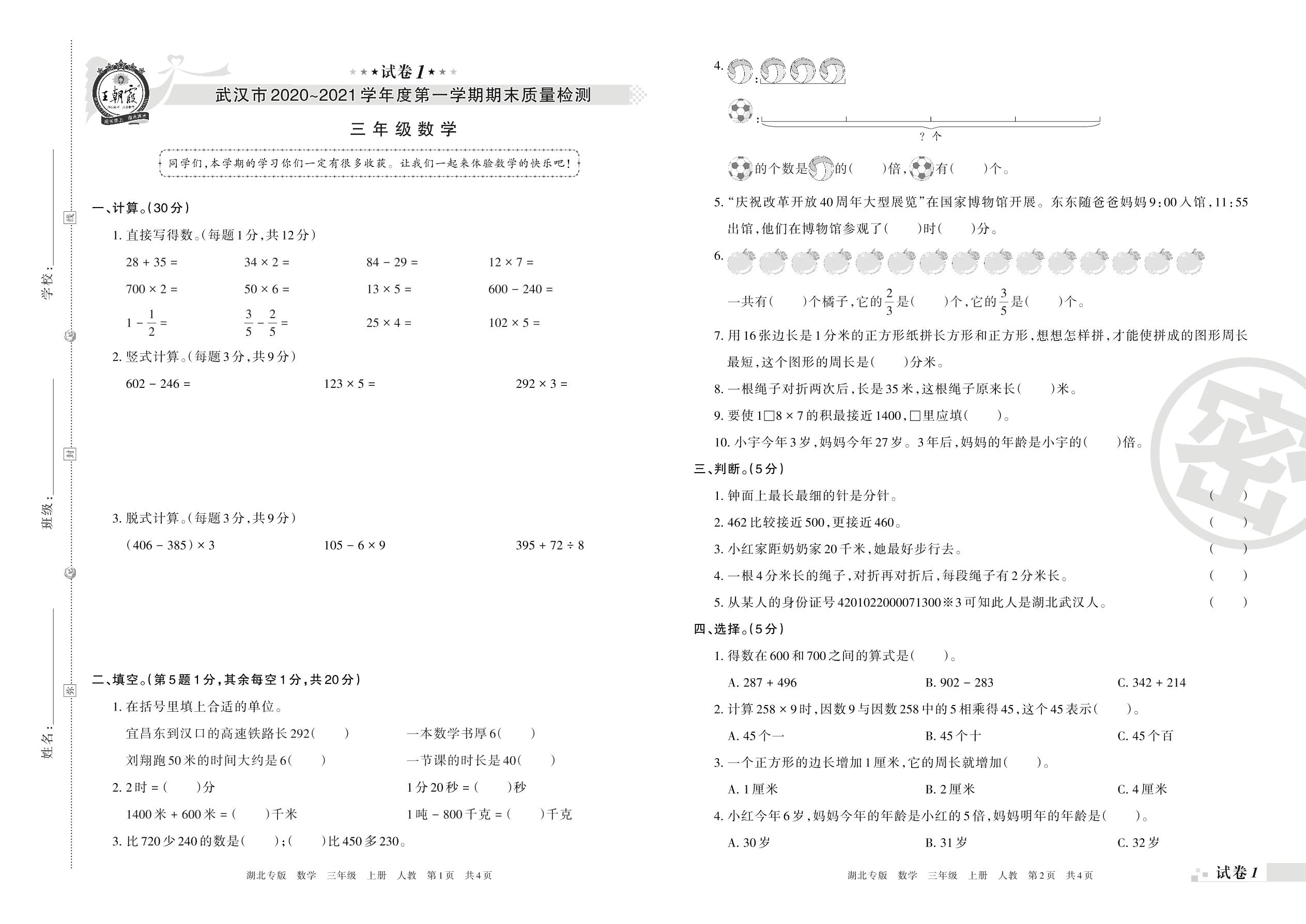 武汉市2020~2021学年度第一学期期末质量检测三年级数学(人教版)【1】