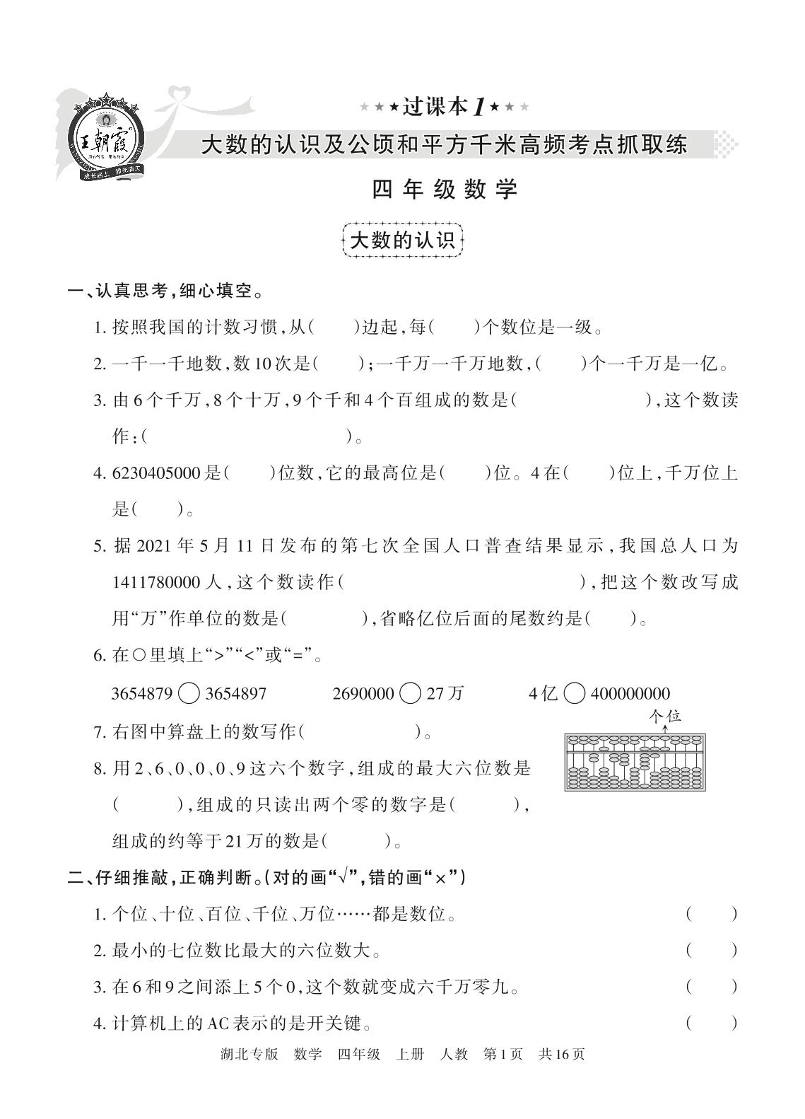王朝霞期末过课本——大数的认识及公顷和平方千米高频考点抓取练四年级上册数学人教版【1】