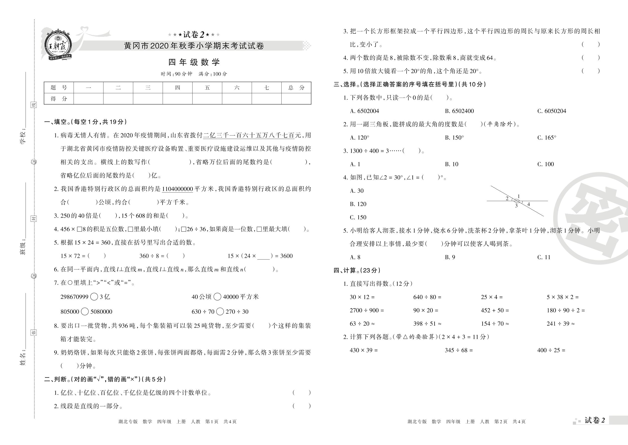 黄冈市2020年秋季小学期末考试试卷四年级数学(人教版)【2】