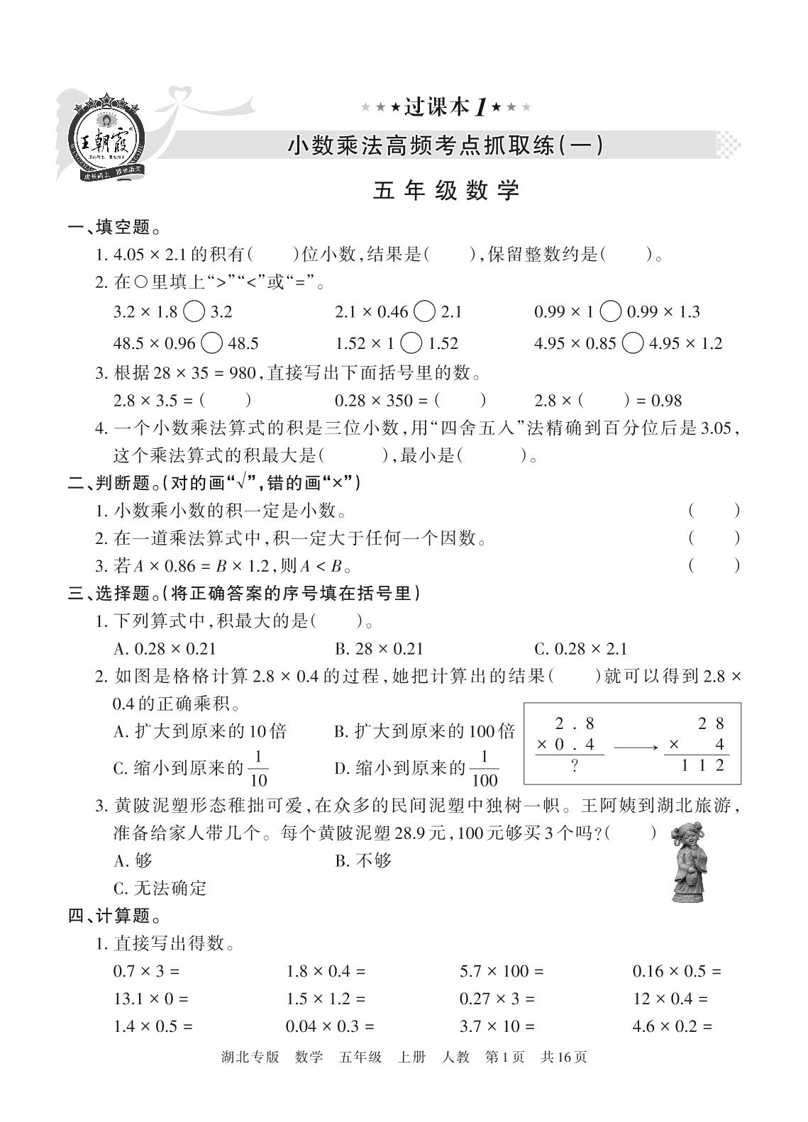 王朝霞期末过课本——小数乘法高频考点抓取练(一)五年级上册数学人教版【1】