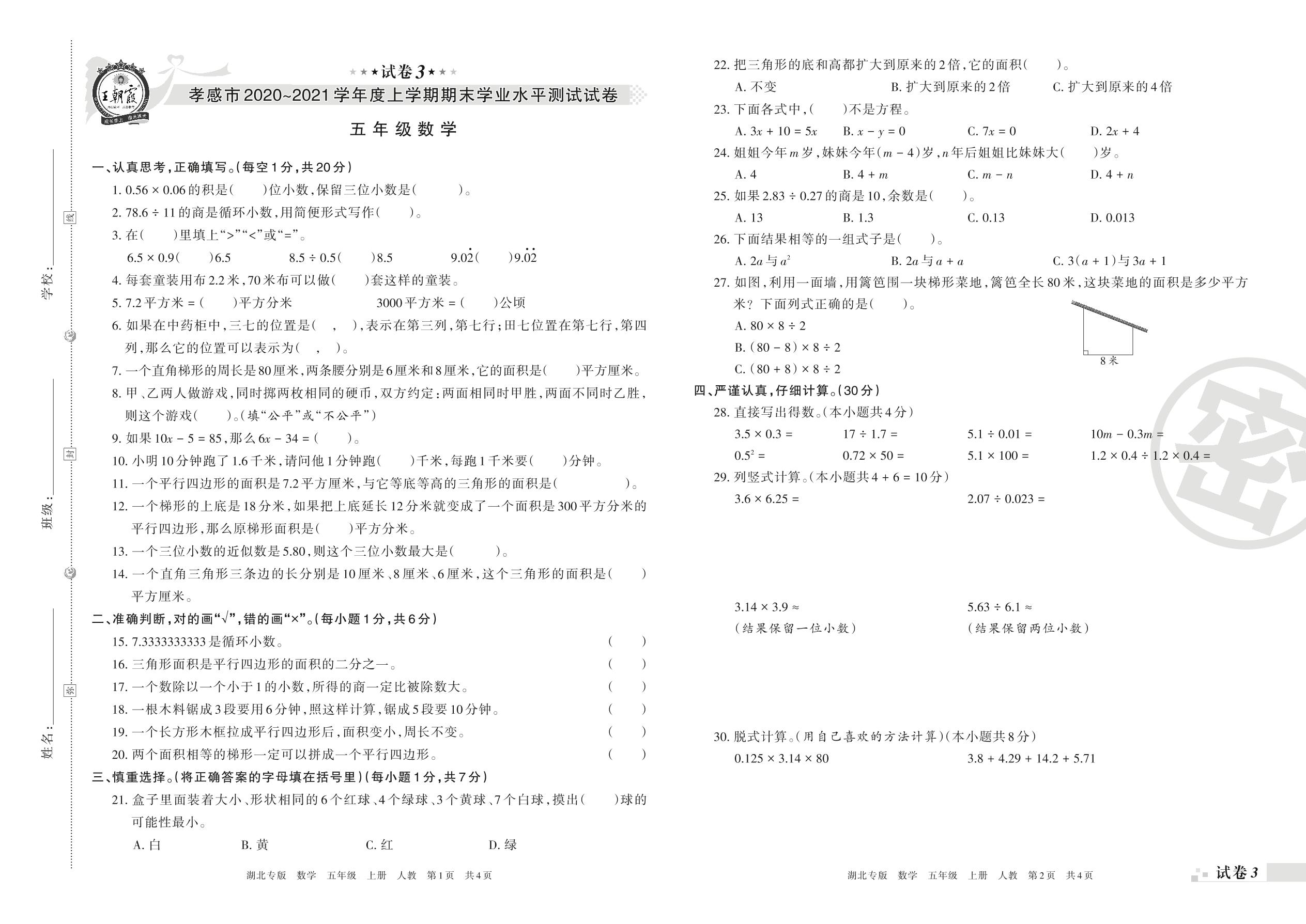 孝感市2020~2021学年度上学期期末学业水平测试试卷五年级数学(人教版)【3】