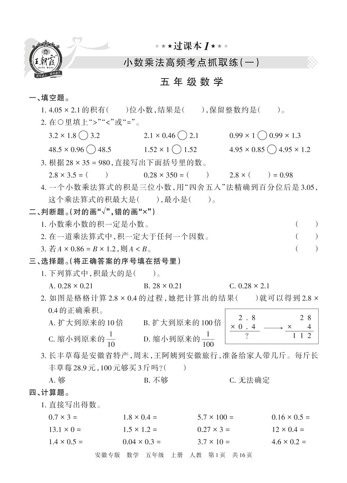 王朝霞期末过课本——小数乘法高频考点抓取练(一)五年级上册数学(人教版)【1】