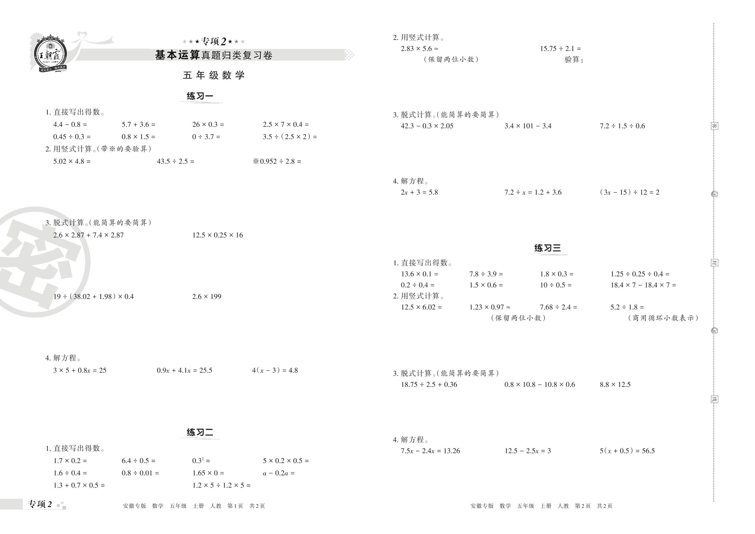 王朝霞期末专项卷——基本运算真题归类复习五年级上册数学(人教版)【2】