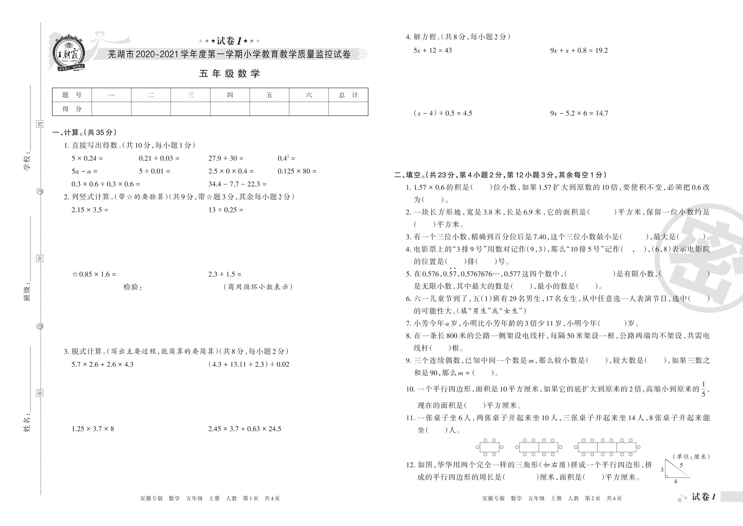 芜湖市2020~2021学年度第一学期小学教育教学质量监控试卷五年级数学(人教版)【1】