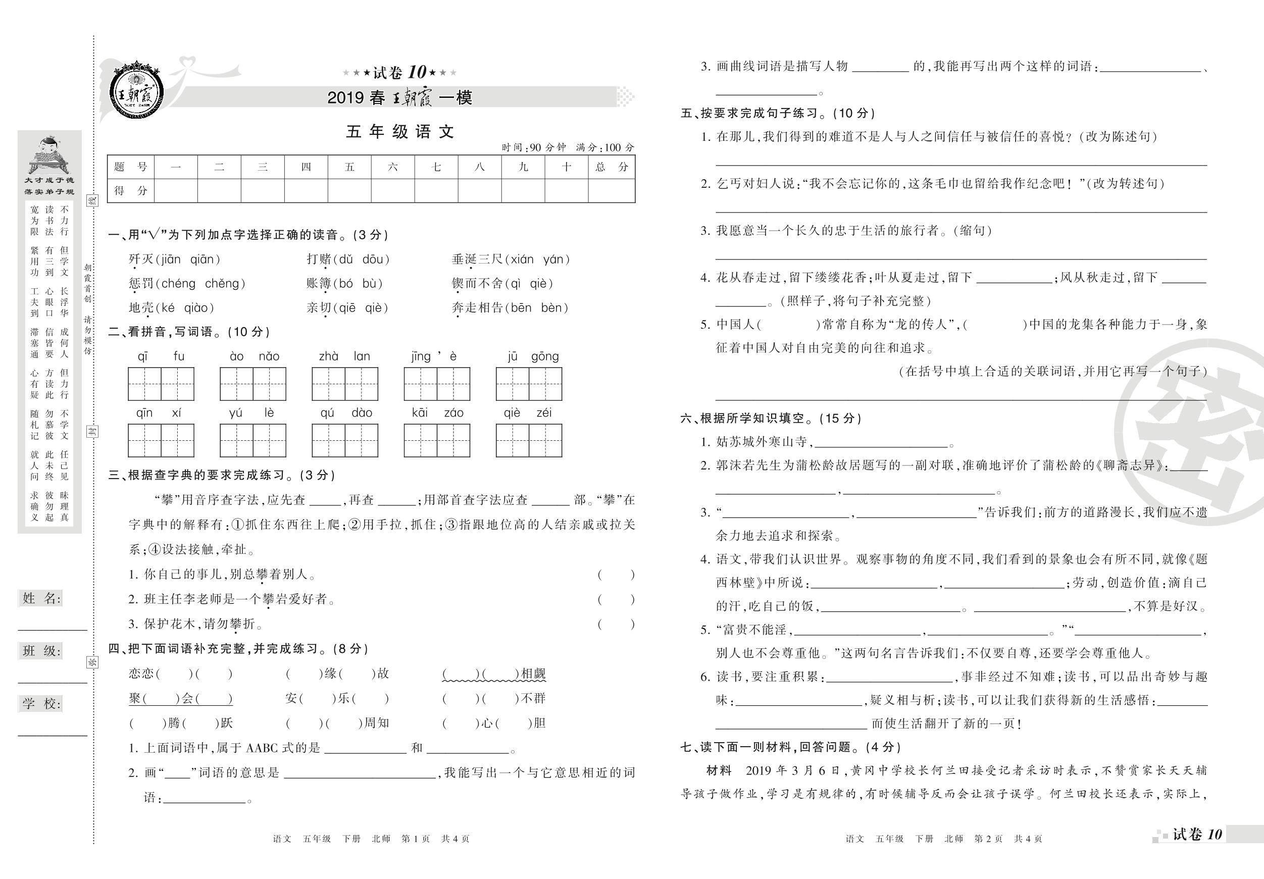 王朝霞期末模拟卷五年级下册语文(北师版)【10】