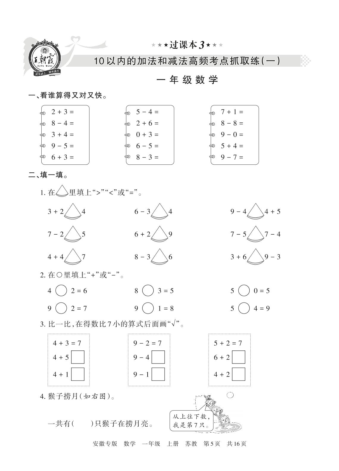 王朝霞期末过课本——10以内的加法和减法高频考点抓取练(一)一年级上册数学(苏教版)【3】