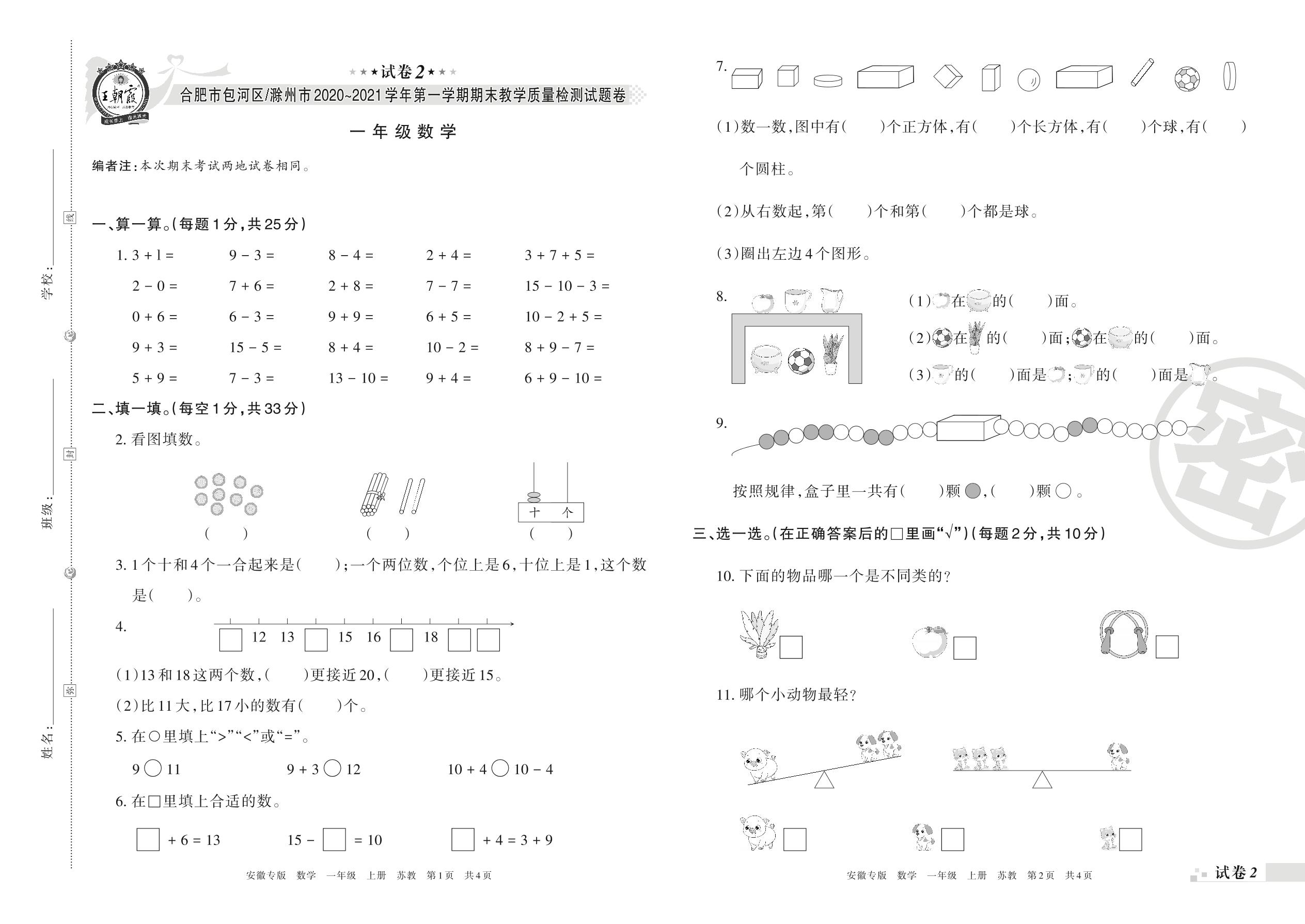 合肥市包河区、滁州市2020~2021学年第一学期期末教学质量检测试题卷一年级数学(苏教版)【2】