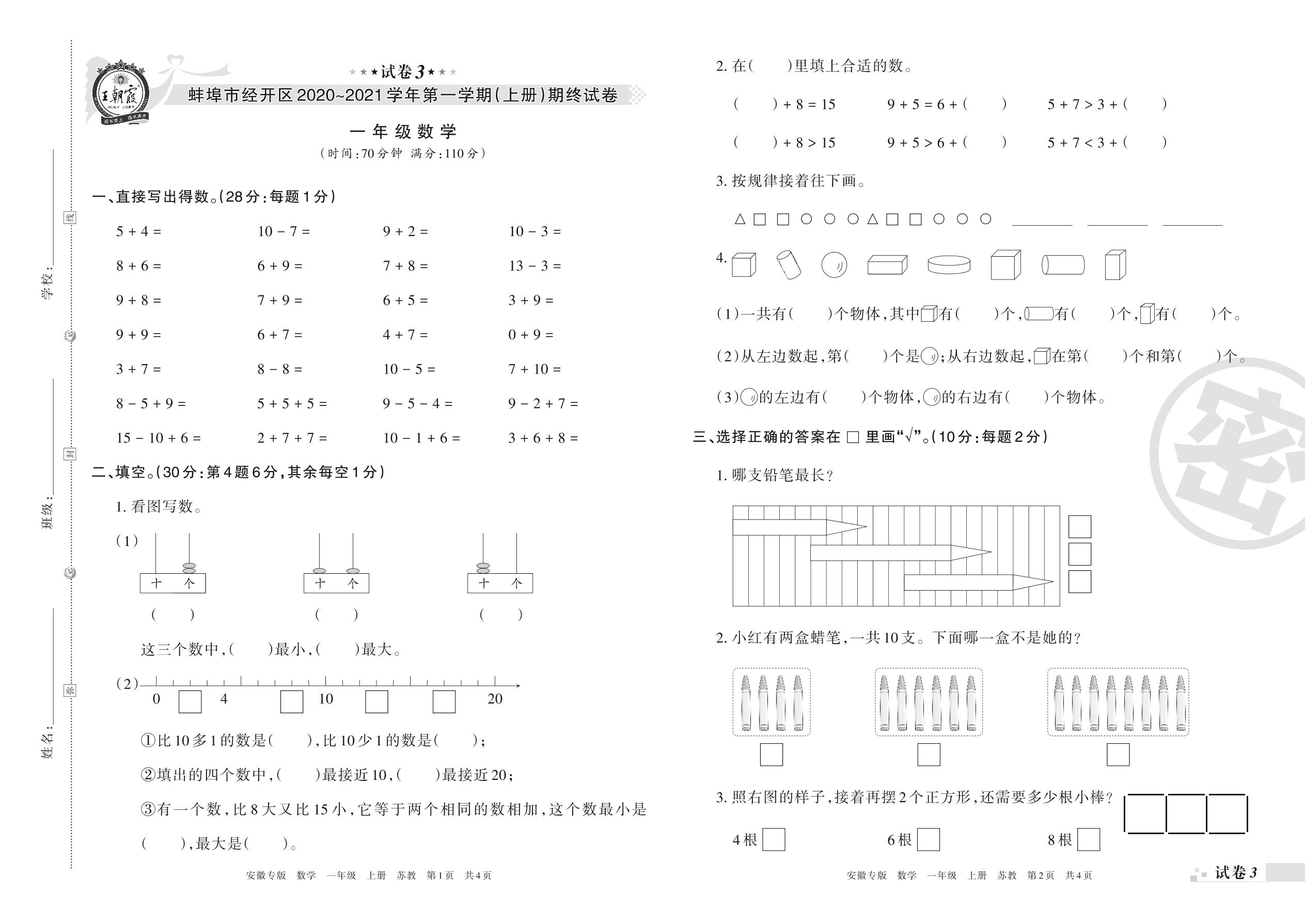 蚌埠市经开区2020~2021学年第一学期(上册)期终试卷一年级数学(苏教版)【3】