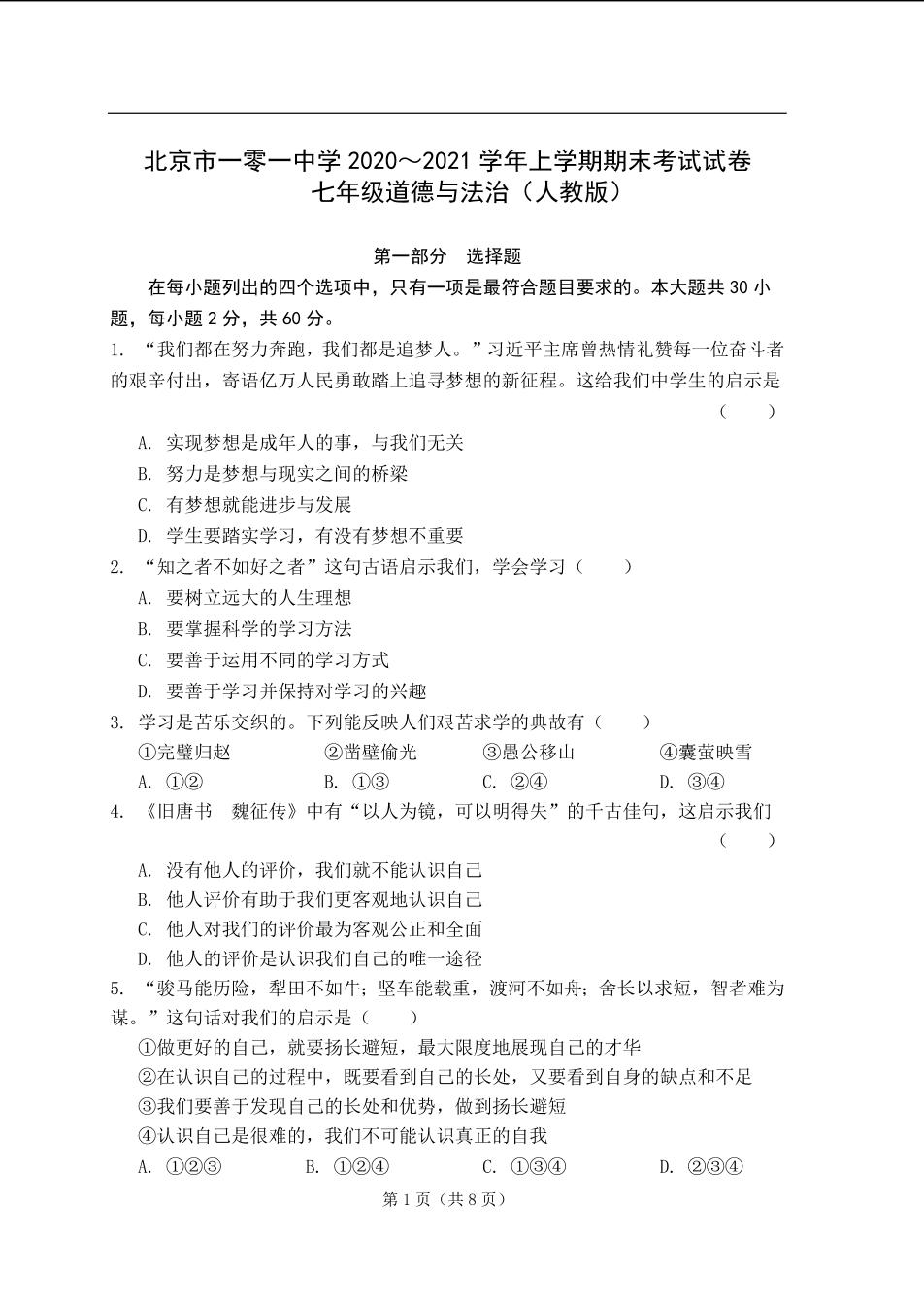 北京市101中学2020~2021学年上学期期末考试试卷七年级道德与法治(人教版)