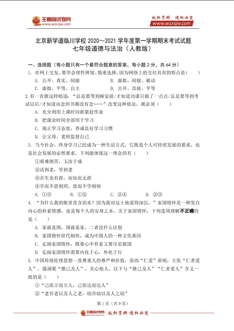 北京市新学道临川学校2020~2021学年度第一学期期末考试试题七年级道德与法治(人教版)