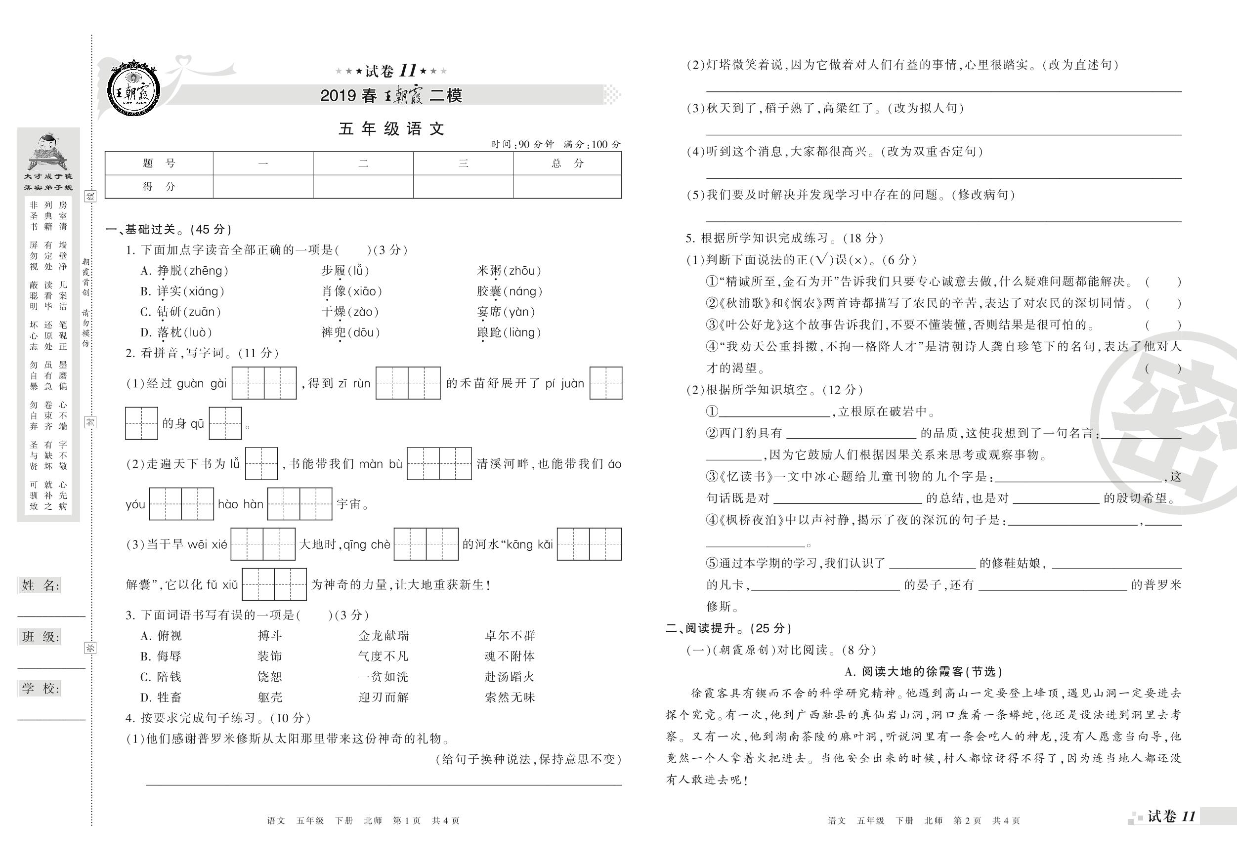王朝霞期末模拟卷五年级下册语文(北师版)【11】