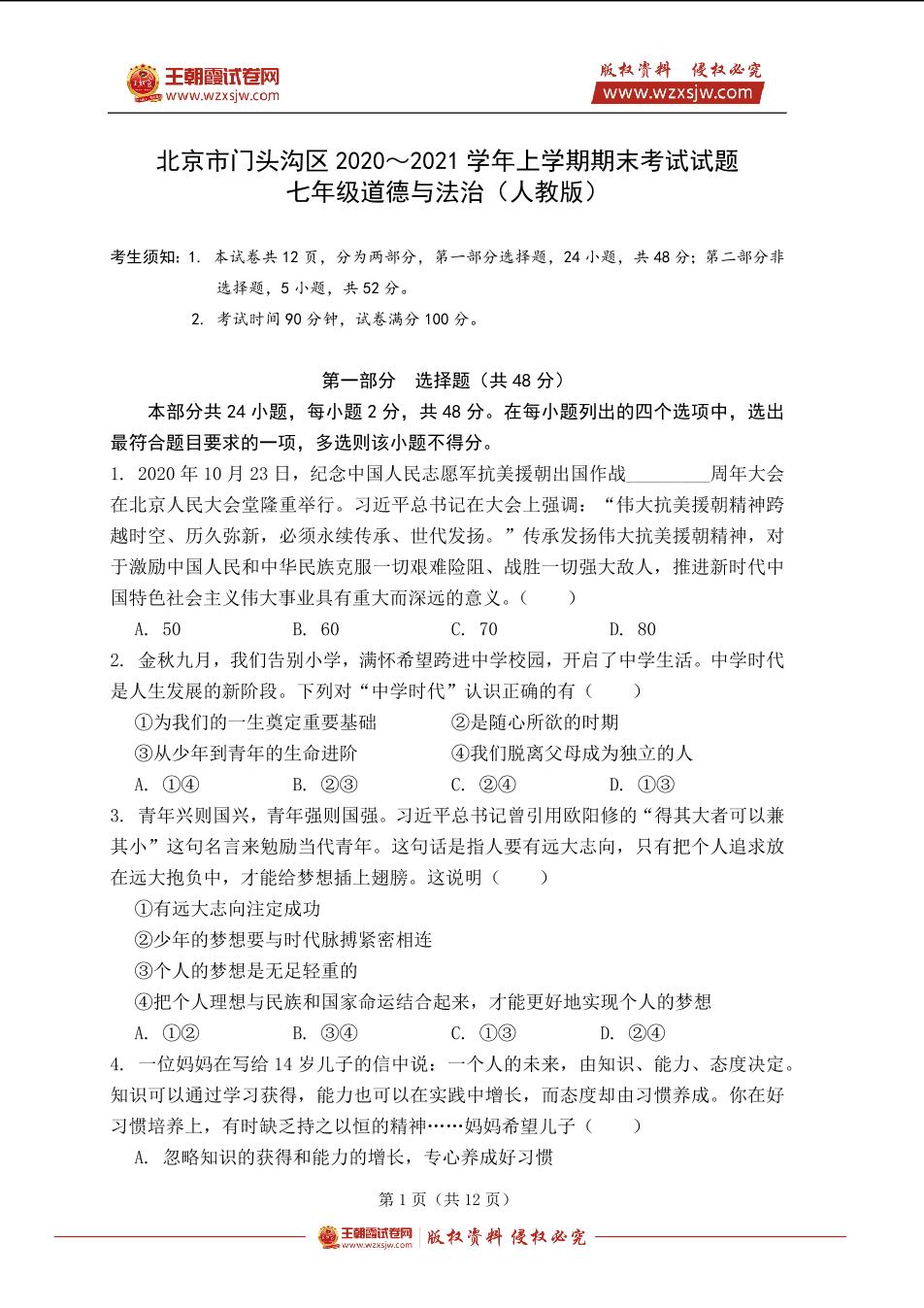 北京市门头沟区2020~2021学年七年级上学期期末考试道德与法治试题(人教版)