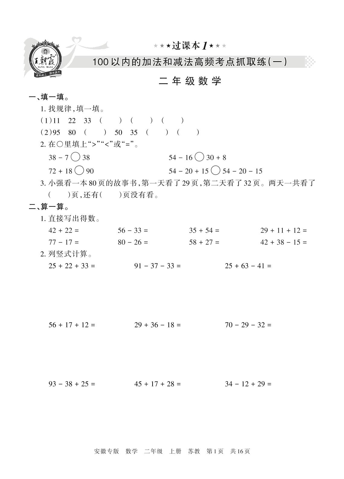 王朝霞期末过课本——100以内的加法和减法高频考点抓取练(一)二年级上册数学(苏教版)【1】