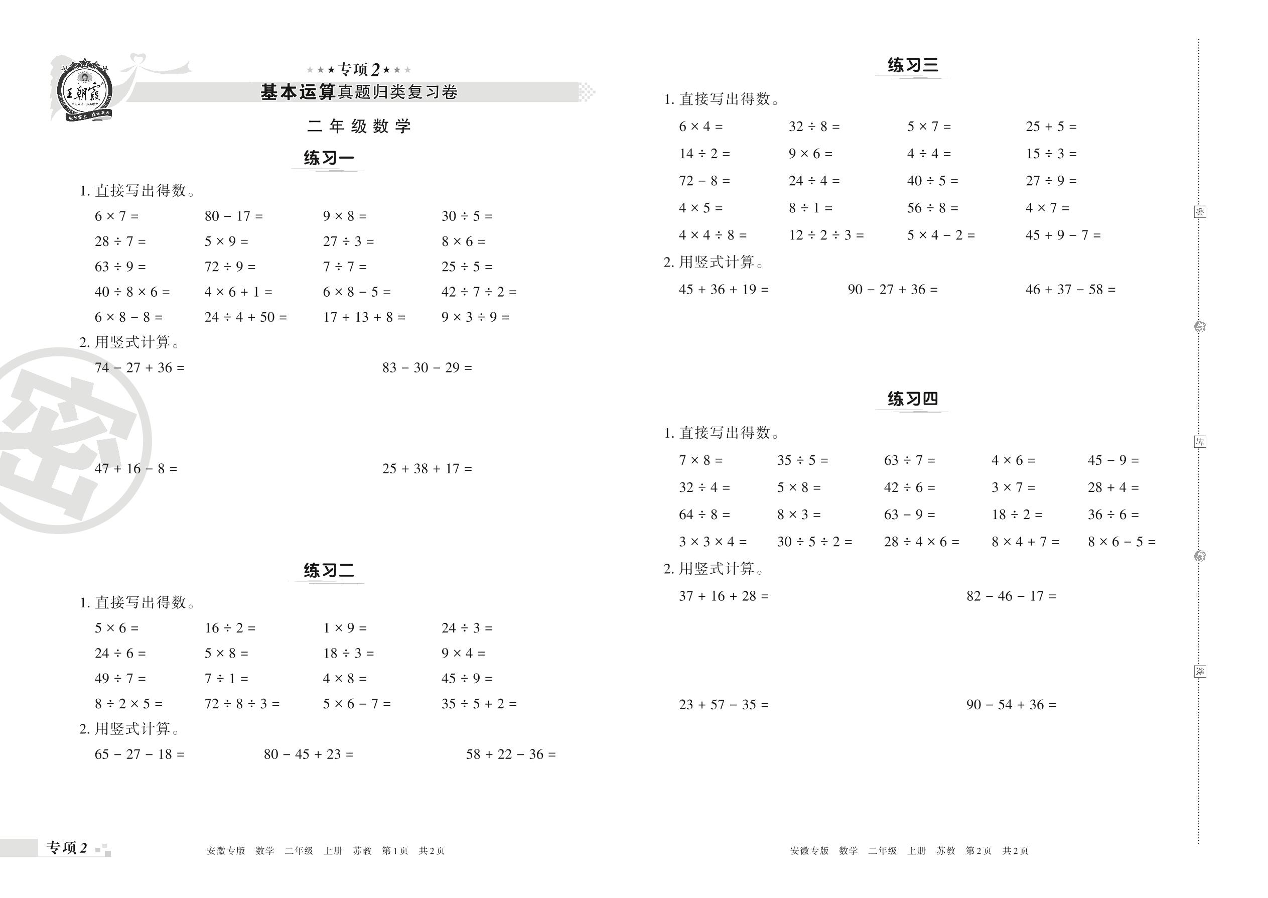 王朝霞期末专项卷——基本运算真题归类复习二年级上册数学(苏教版)【2】