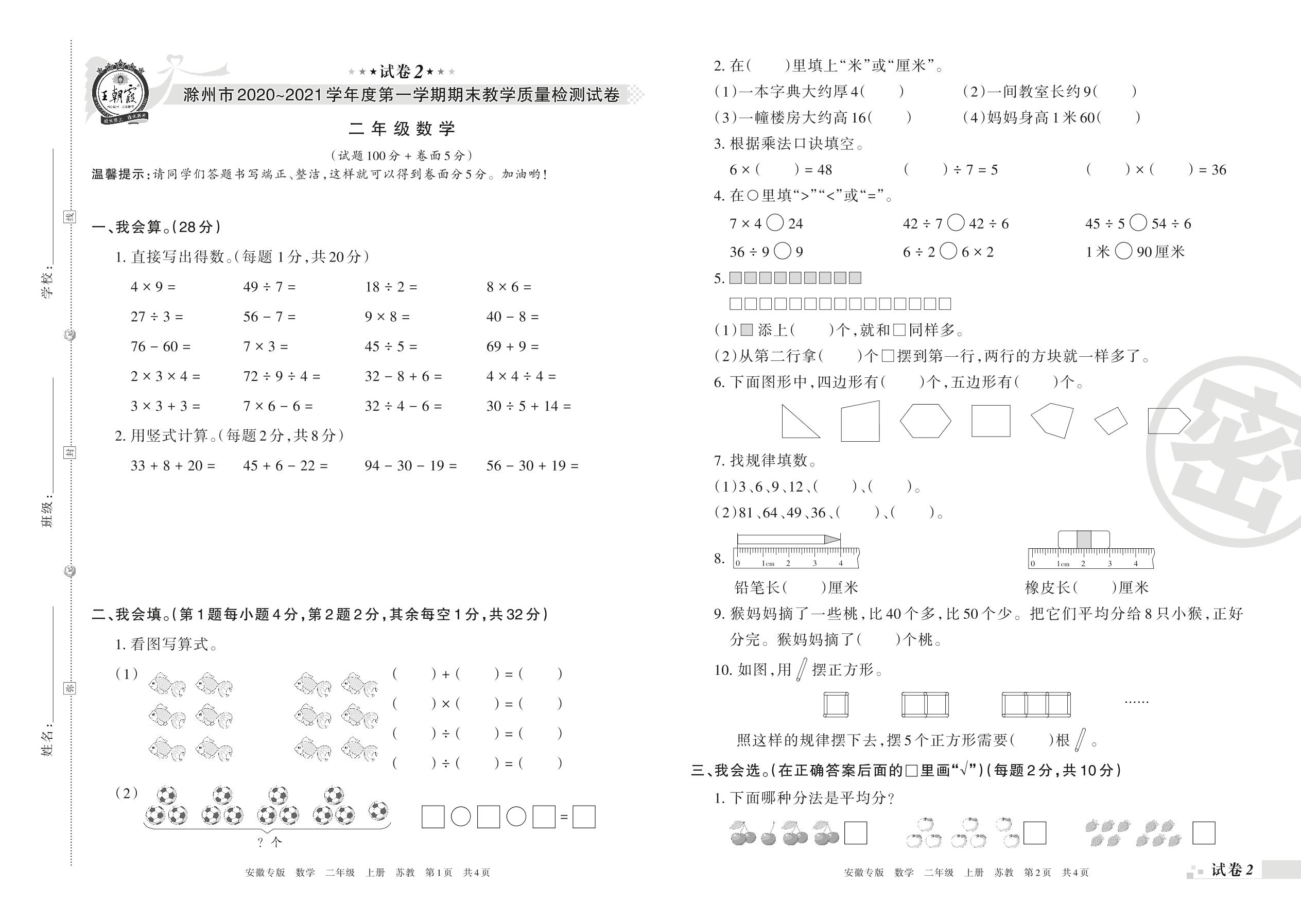 滁州市2020~2021学年度第一学期期末教学质量检测试卷二年级数学(苏教版)【2】
