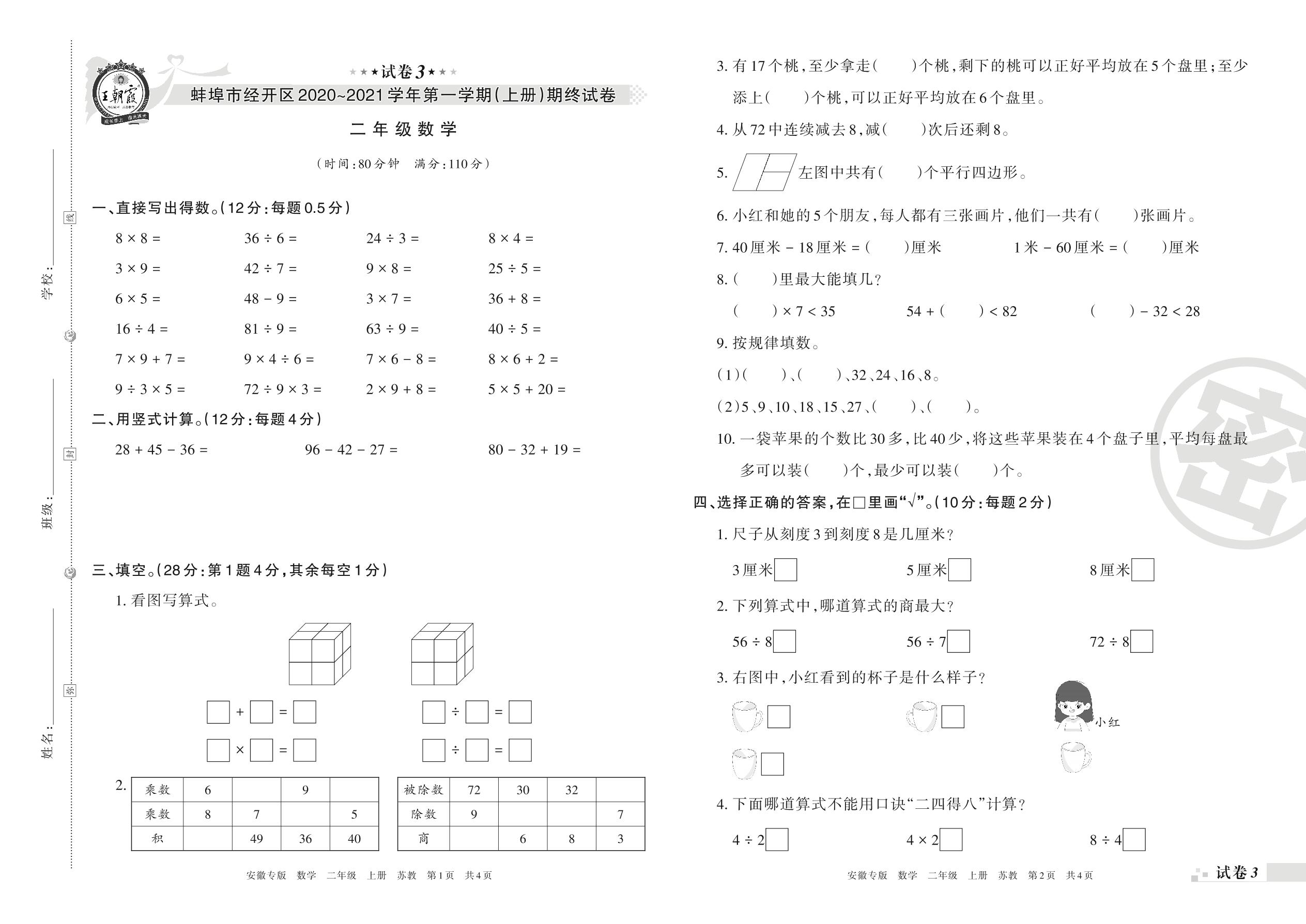 蚌埠市经开区2020~2021学年第一学期(上册)期终试卷二年级数学(苏教版)【3】