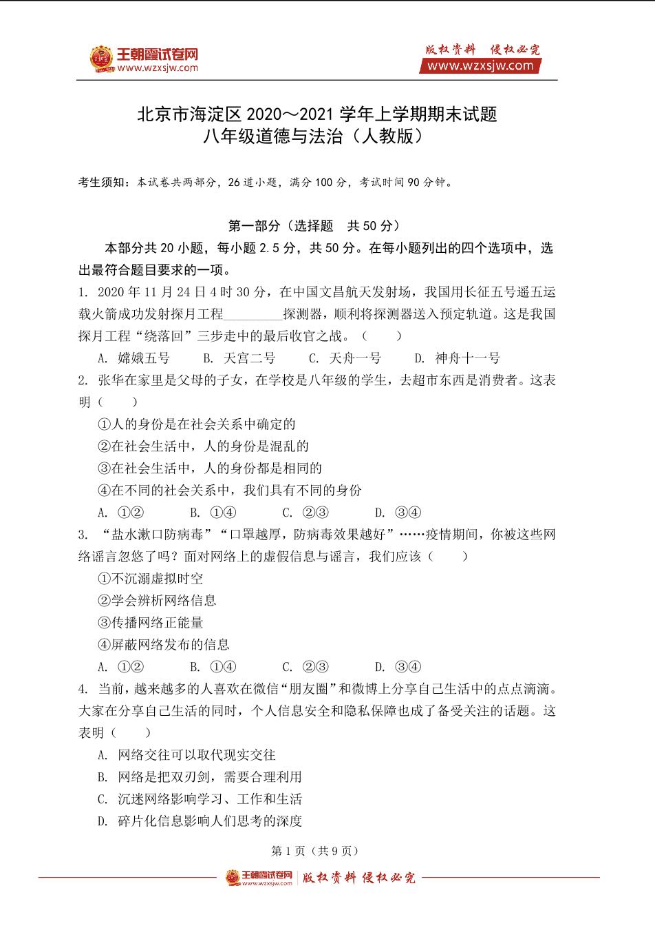 北京市海淀区2020~2021学年八年级上学期期末道德与法治试题(人教版)