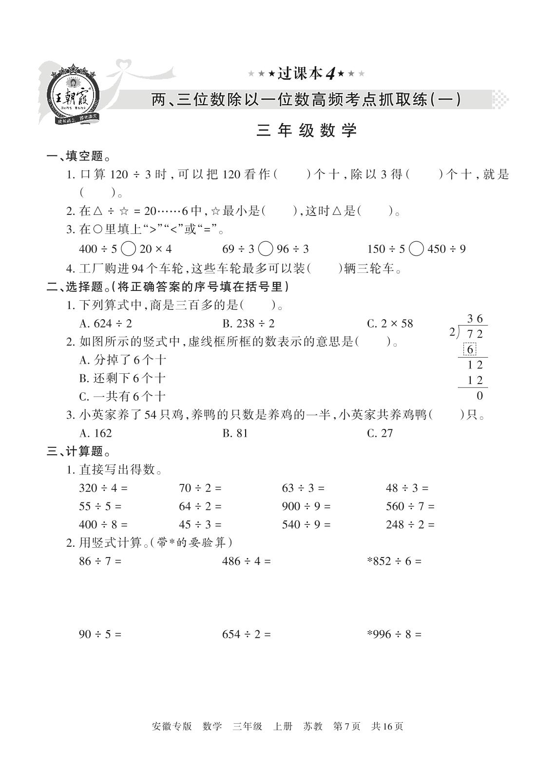 王朝霞期末过课本——两、三位数除以一位数高频考点抓取练(一)三年级上册数学(苏教版)【4】