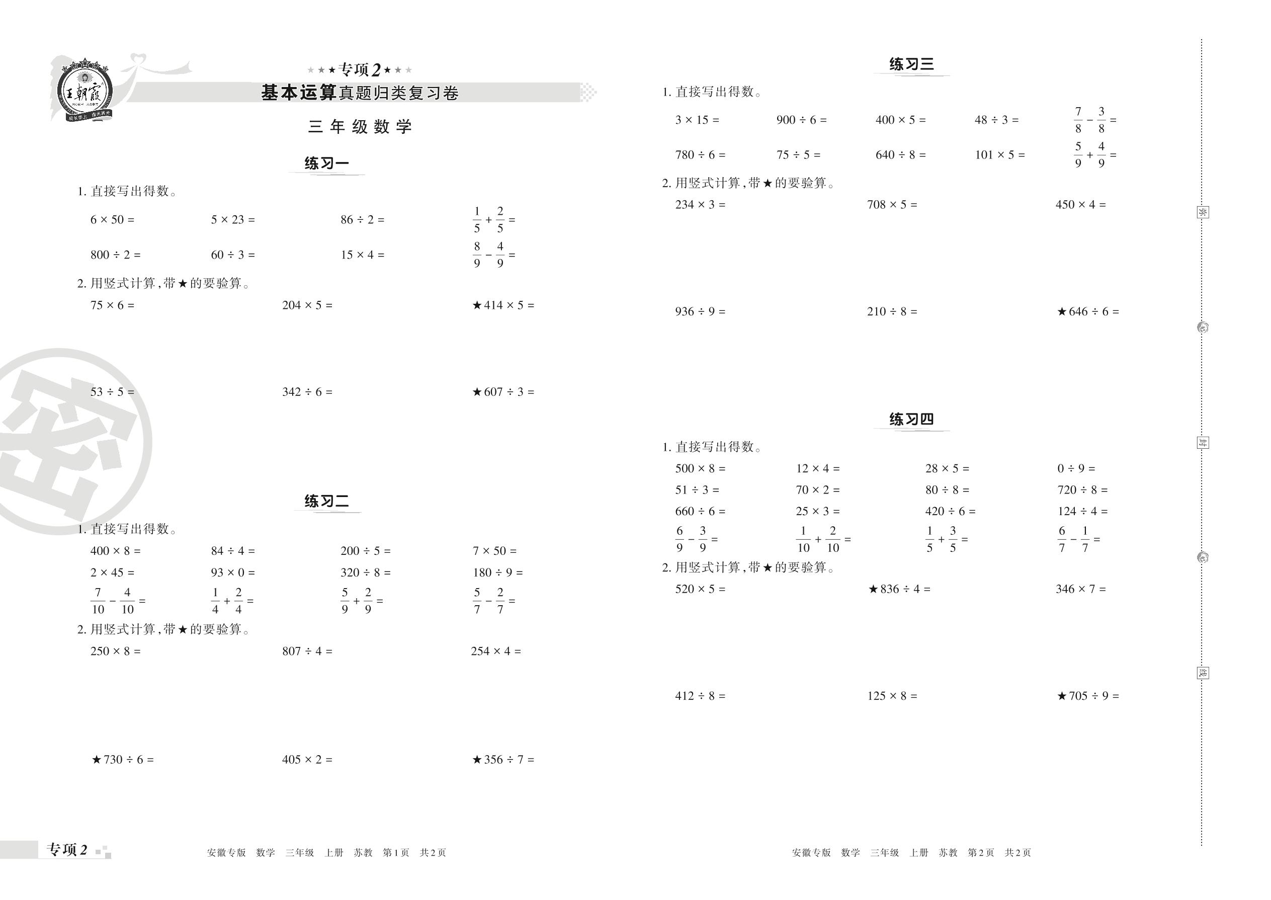 王朝霞期末专项卷——基本运算真题归类复习三年级上册数学(苏教版)【2】