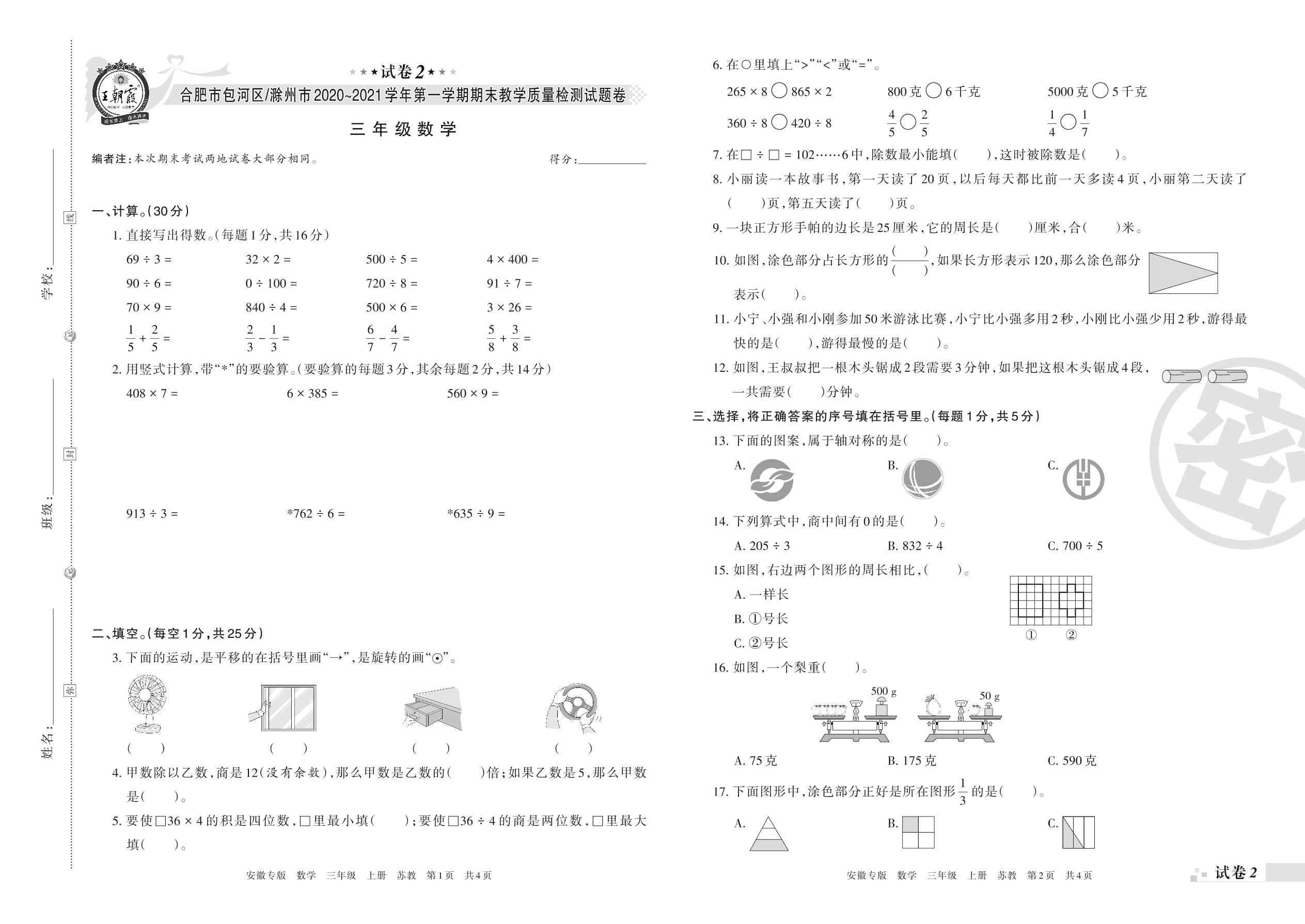 合肥市包河区、滁州市2020~2021学年第一学期期末教学质量检测试题卷三年级数学(苏教版)【2】