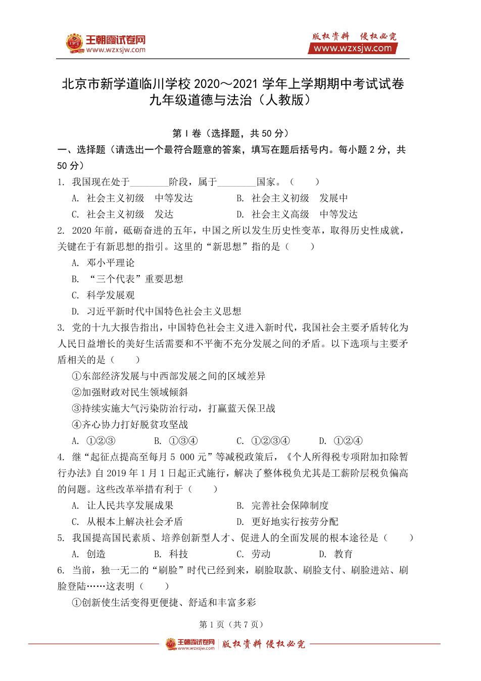 北京市新学道临川学校2020~2021学年九年级上学期期中考试道德与法治试卷