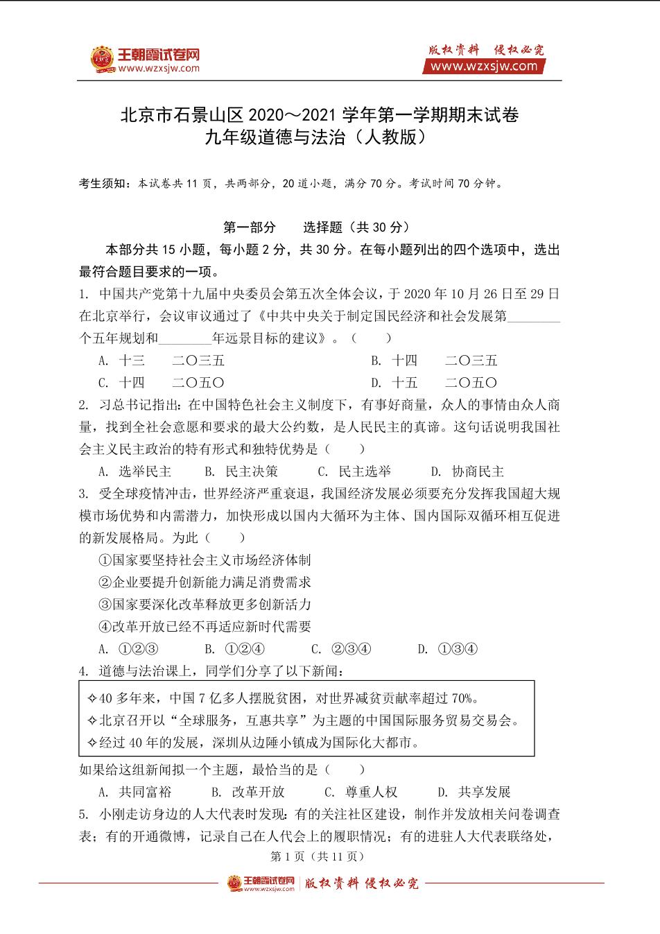 北京市石景山区2020~2021学年第一学期期末试卷九年级道德与法治(人教版)