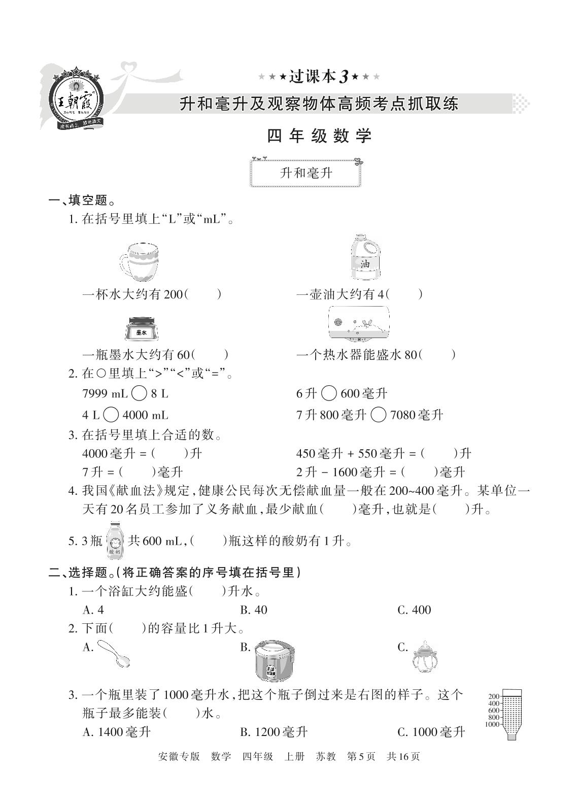王朝霞期末过课本——升和毫升及观察物体高频考点抓取练四年级上册数学(苏教版)【3】