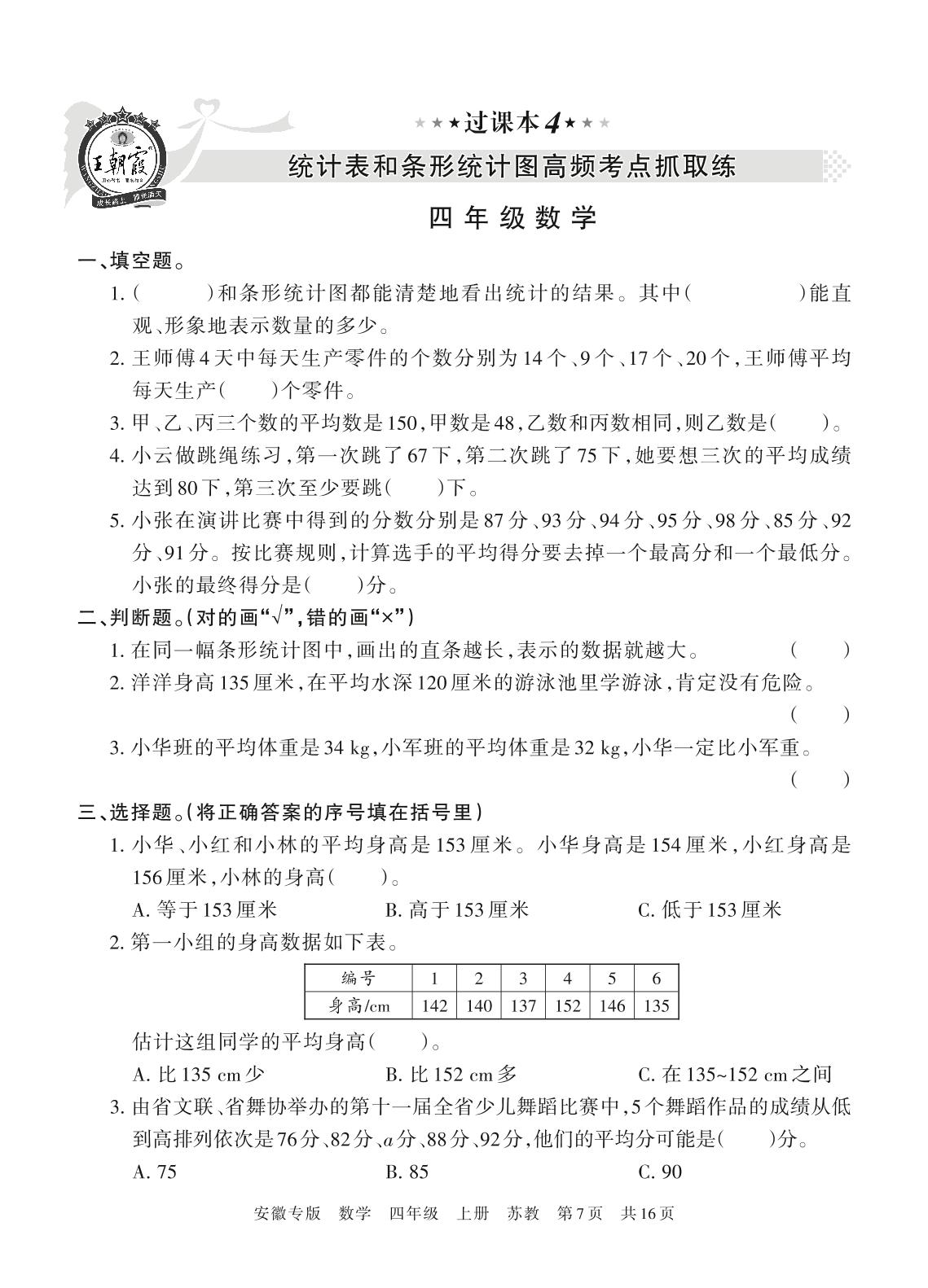 王朝霞期末过课本——统计表和条形统计图高频考点抓取练四年级上册数学(苏教版)【4】
