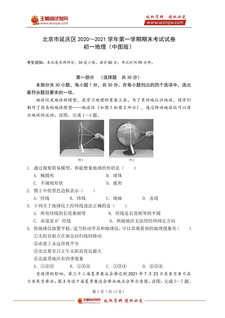 北京市延庆区2020~2021学年七年级上学期期末考试地理试题(中图版)