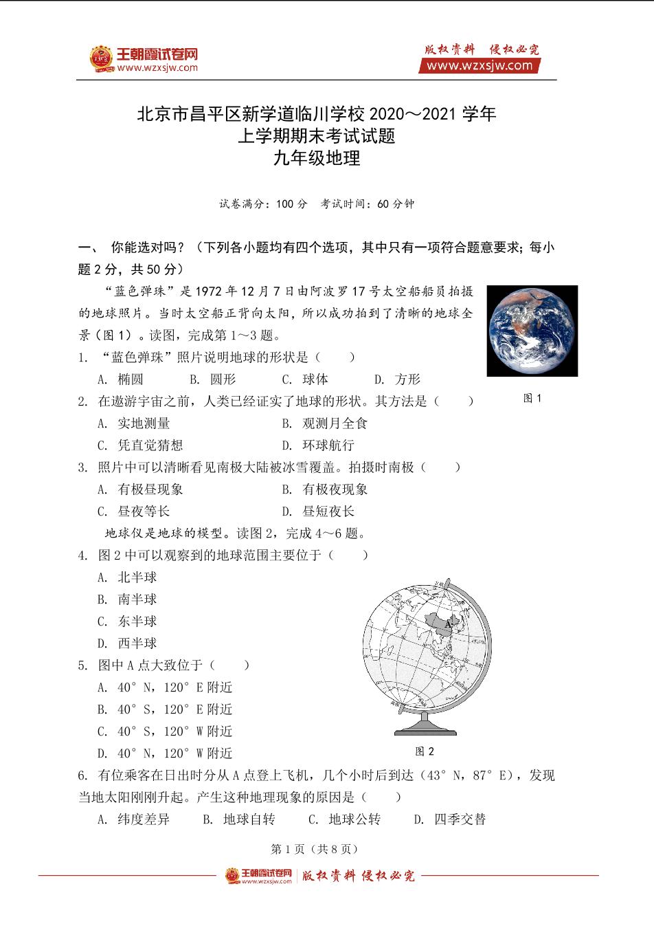 北京市昌平区新学道临川学校2020~2021学年九年级上学期期末考试地理试题