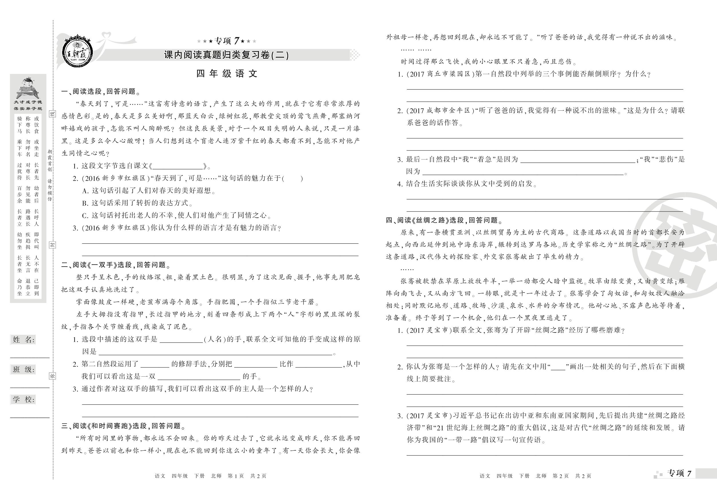 王朝霞期末专项卷——课内阅读、课外阅读与写作真题归类复习四年级下册语文(北师版)_R210801201925【0】