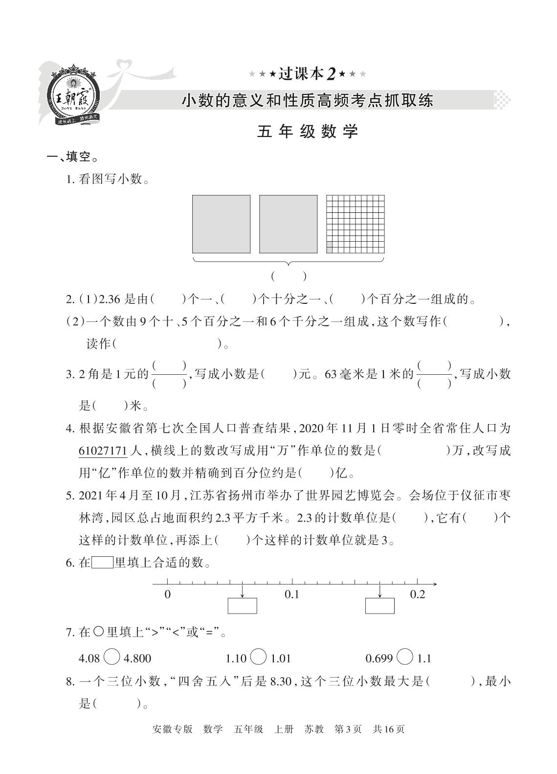 王朝霞期末过课本——小数的意义和性质高频考点抓取练五年级上册数学(苏教版)【2】