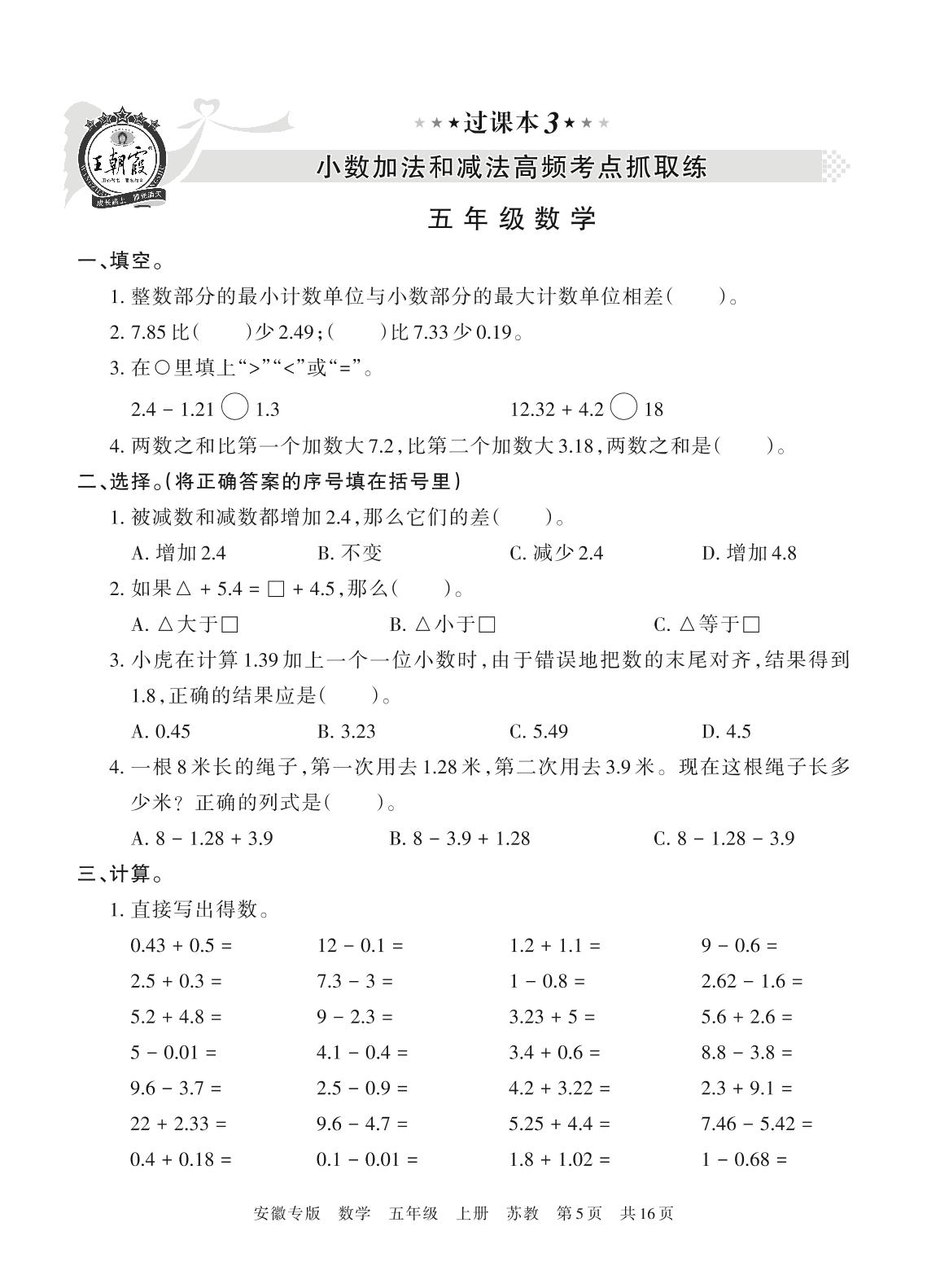 王朝霞期末过课本——小数加法和减法高频考点抓取练五年级上册数学(苏教版)【3】