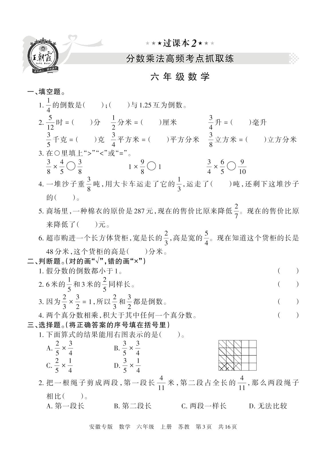 王朝霞期末过课本——分数乘法高频考点抓取练六年级上册数学(苏教版)【2】